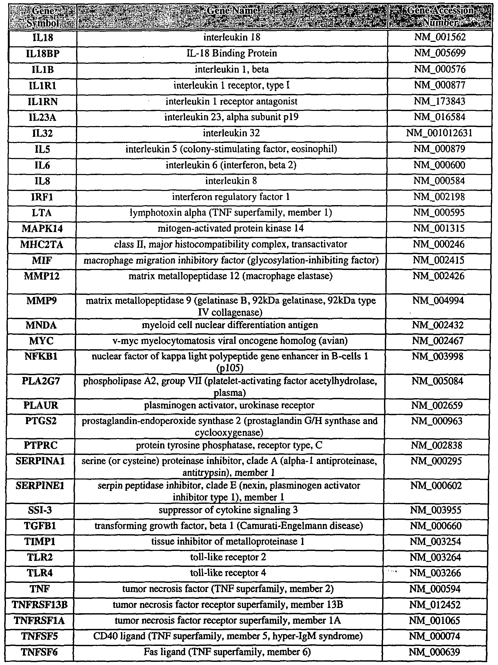 - the constituent is selected from Table 2 and is selected from: i) EGRl, CASPl, SERPINAl, ICAMl, NFKBl, AL0X5, HSPAlA, IFIl 6, ELA2, PLAUR, TLR2, TNF, PLA2G7, ILlRl, MAPK14, ILlRN, TXNRDl, IRFl, MNDA, TLR4, PTGS2, or TNFRSFlA; ii) MMP9, ELA2, SERPINAl, IFI16, TLR2, MAPK14, AL0X5, EGRl, or SERPINEl; or iii) SERPINAl, EGRl, ELA2, IFI16, ALOX5, ILlRl, MAPK14, ICAMl, or TIMPl.