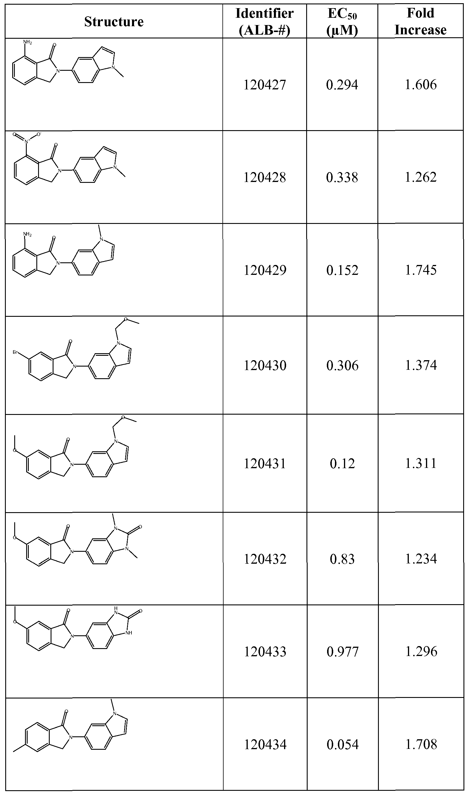 [0037] In an additional embodiement, R5 can be selected from H, hydroxyl, halogen, C1- C8 alkyl, C1-C8 alkoxy, C1-C8 haloalkoxy, amino, C1-C4 alkylamino, or -NR7C(O)R8. R5 preferably is H, Ci-C8 alkyl, -NHC(O)R8, Ci-C6 alkoxy, Ci-C6 haloalkoxy, amino, and Ci-C4 alkylamino. This embodiment optionally can be employed in combination with the particular embodiments and aspects discussed with respect to R1, W, R2, R3, and R4. [0038] As an alternative to one or more of the foregoing embodiements, but optionally in combination with others as applicable, R2 and R3, R3 and R4 or R4 and R5 can be taken together with the carbon atoms to which they are attached to form a 5- or 6-membered cycloalkyl or heterocycloalkyl comprising 1 or 2 heteroatoms selected from the group consisting of N, O, and S. For example, R3 and R4 can be taken together as -OCH2CH2O- to form a fused bicyclic ring with the benzene core of the compound of Formula I. [0039] Specific examples of compounds of the invention are provided in Table 1. Accordingly, the invention encompasses each of the compounds provided in Table 1. In a preferred embodiment, the compound is selected from the group consisting of