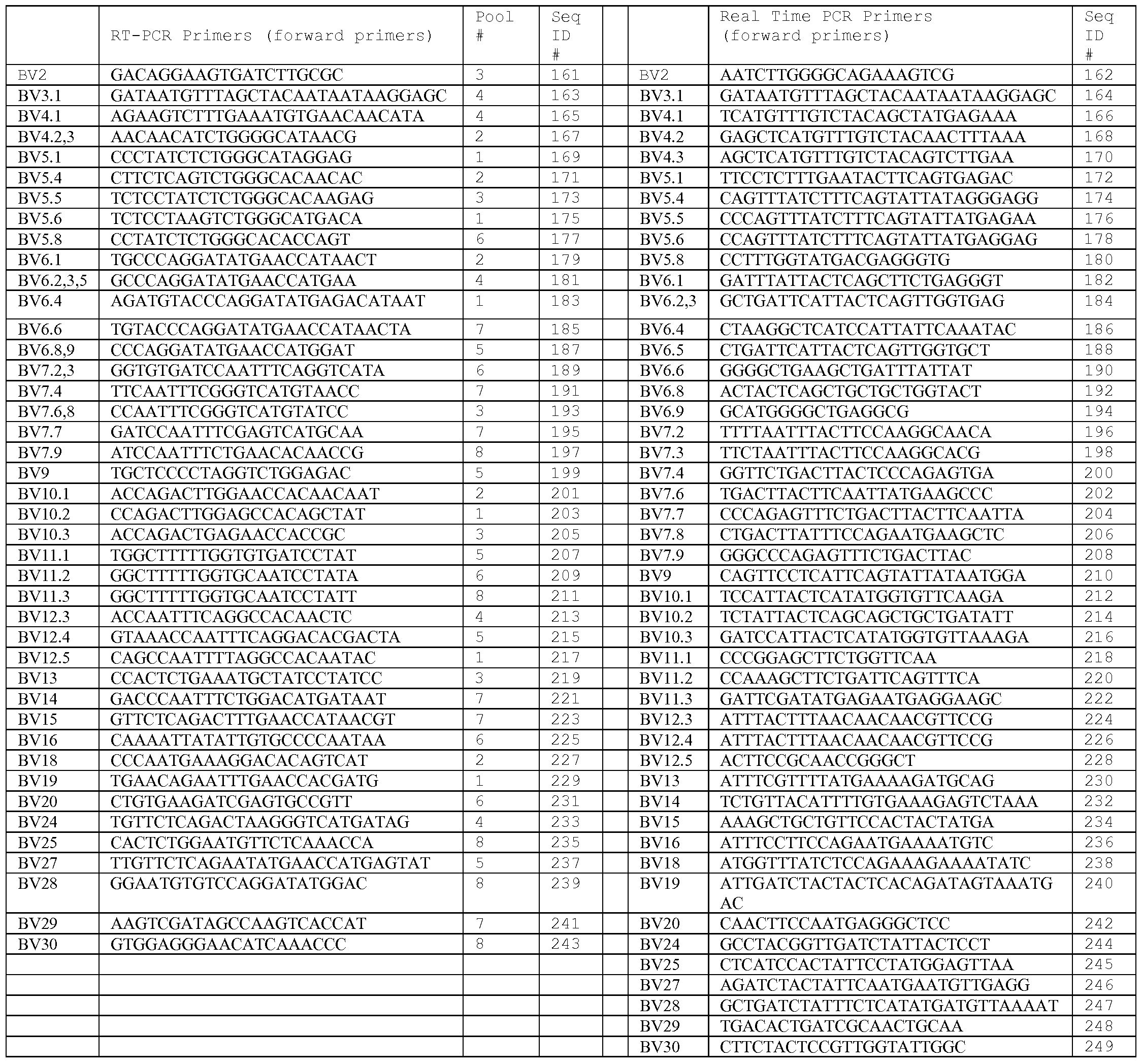- the increased resolution associated with matrices of, for example, 240 BV-BJ combinations can improve the efficiency of identifying and sequencing over-represented transcripts due to the increased number of individual PCRs that increases the probability of obtaining products derived predominantly from single beta transcripts.