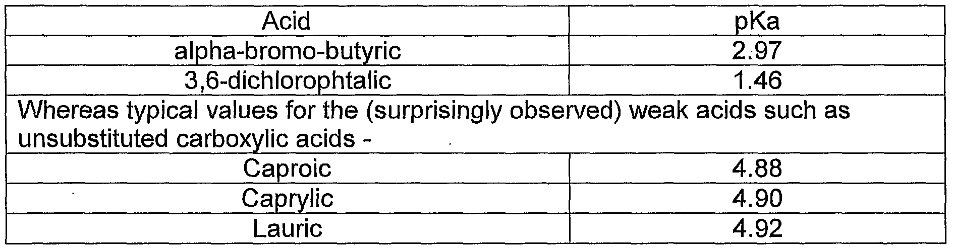 - the weak organic acids measure 2 or more pKa units higher than the acids previously described and claimed, which corresponds to two orders of magnitude lower acidity.
