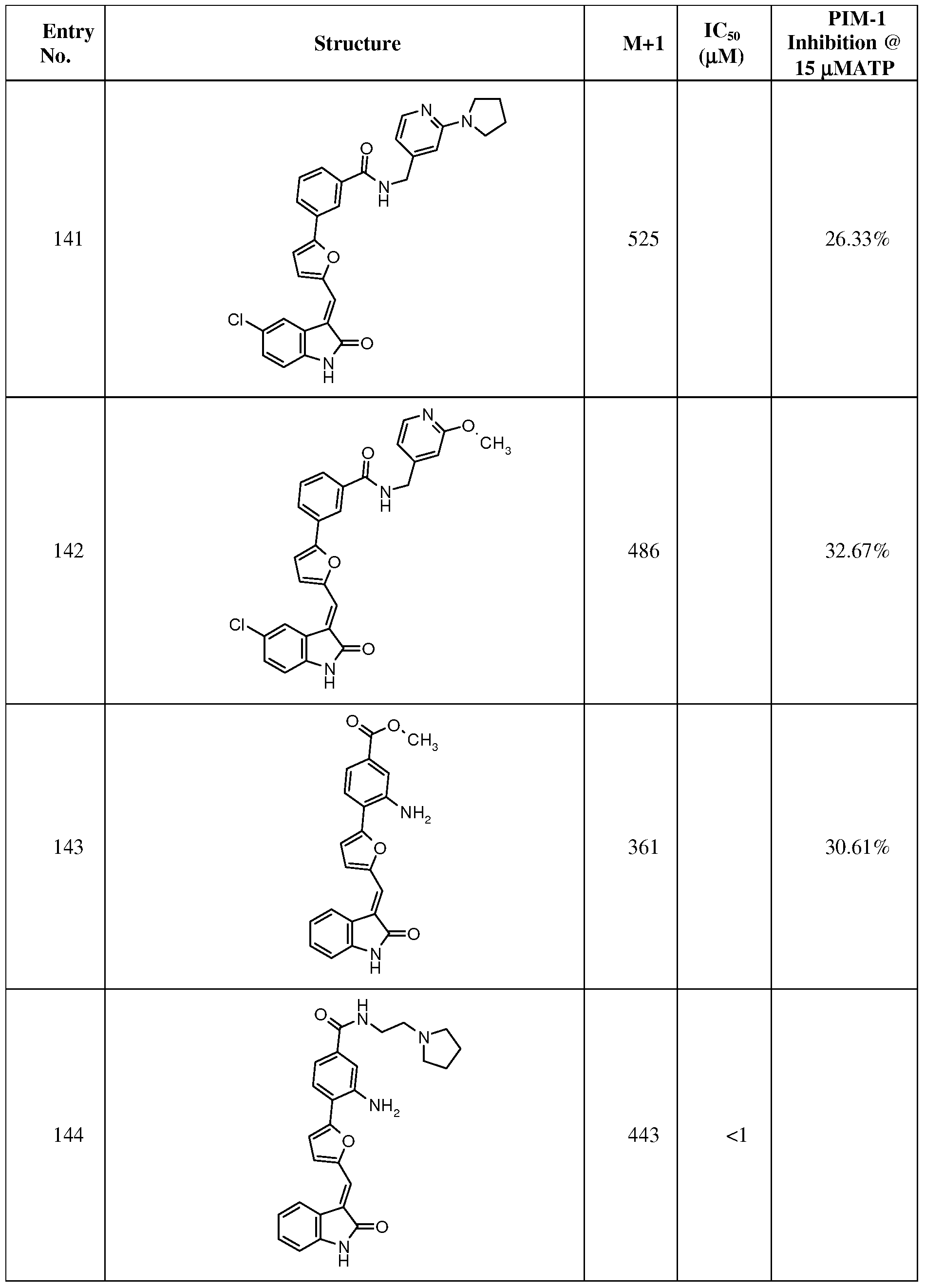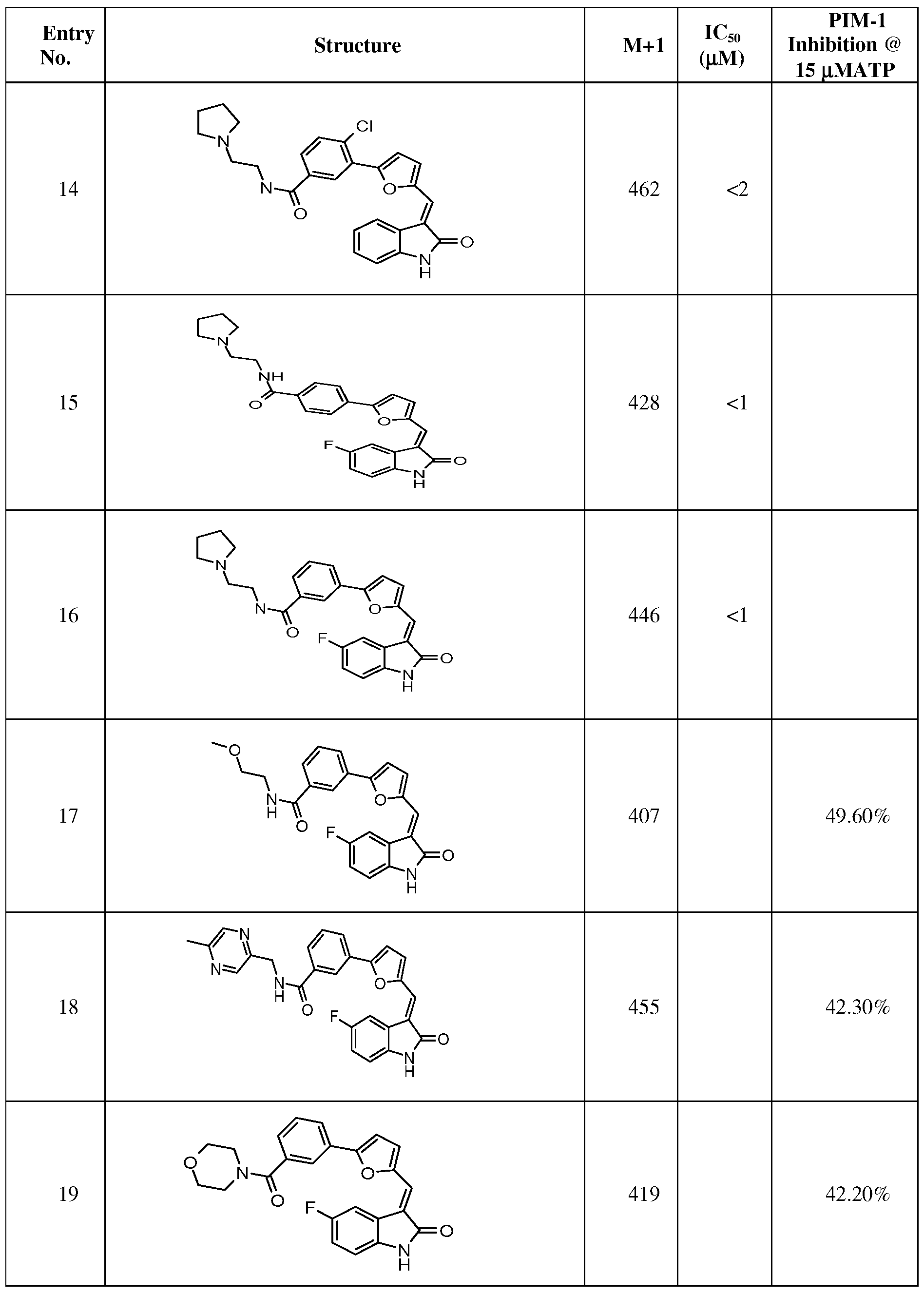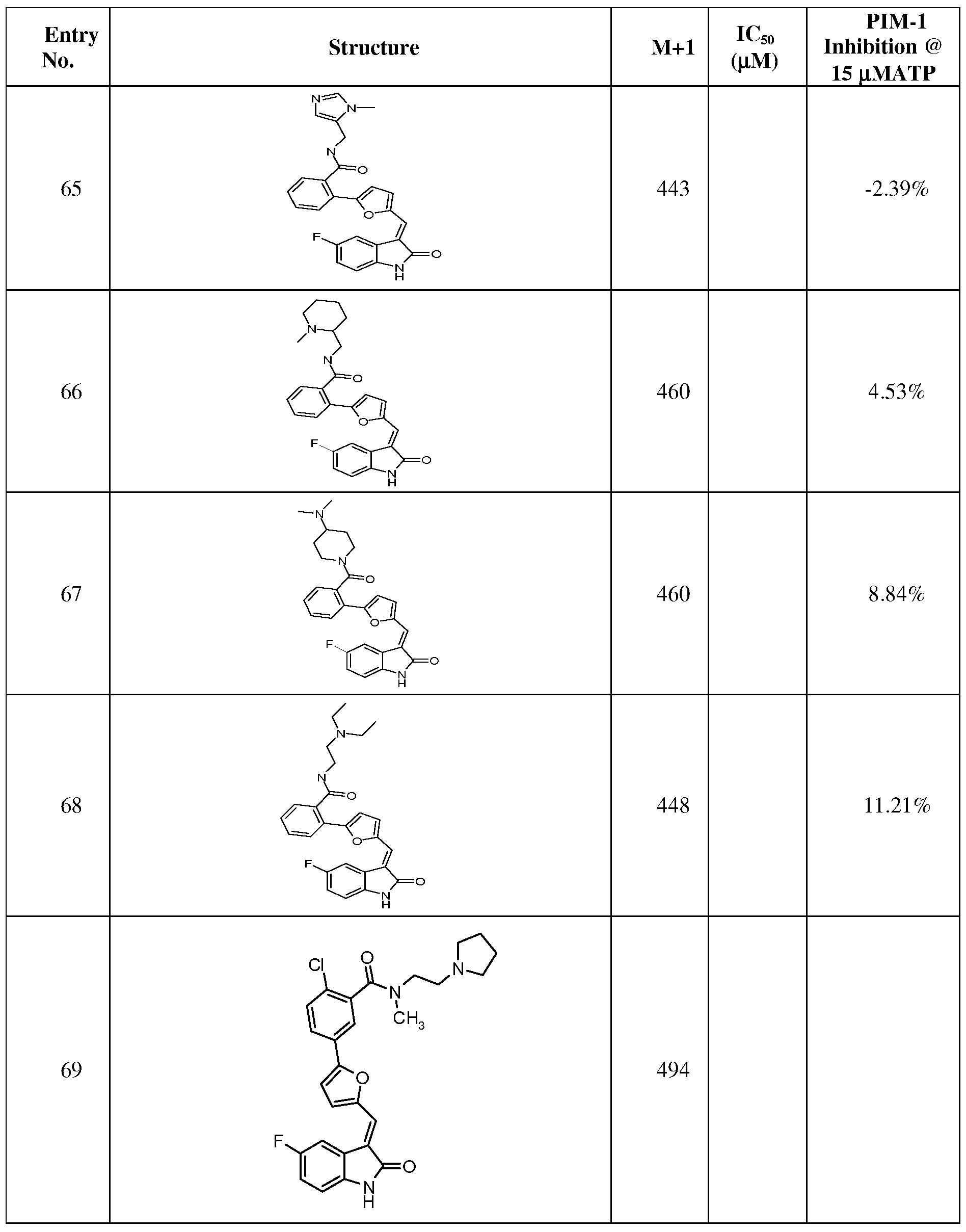 - inhibitors of PIM it is sometimes preferable for inhibitors of PIM to have little or no in vivo impact through their inhibition of various other kinases, since such effects are likely to cause side effects or unpredictable results. See, e.g., O. Fedorov, et al., PNAS 104(51), 20523-28 (Dec. 2007), discussing the effects that non-specific kinase inhibitors can produce.
