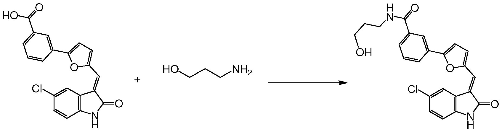 - RUGJASFMGVWDAX-CPNJWEJPSA-N OCCCNC(c1cc(-c2ccc(/C=C(\c(cc(cc3)Cl)c3N3)/C3=O)[o]2)ccc1)=O Chemical compound OCCCNC(c1cc(-c2ccc(/C=C(\c(cc(cc3)Cl)c3N3)/C3=O)[o]2)ccc1)=O RUGJASFMGVWDAX-CPNJWEJPSA-N 0.000 description 1