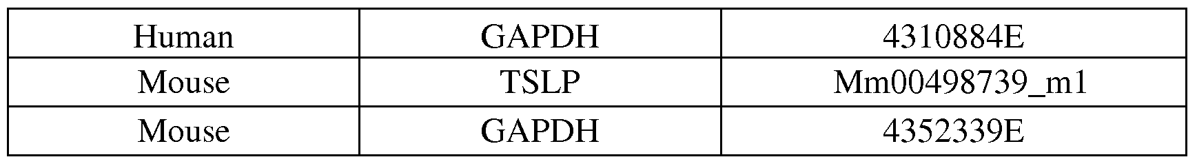 [0011] TSLP expression has also been identified in normal human bronchial epithelial cells (NHBE) after stimulation with IL- lβ, TNFα, the TLR3 ligand poly LC or after rhinovirus infection (Kato et al, 2007). In studies with TSLP reporter constructs in lung epithelial cell lines, IL- lβ, TNFα and TLR2, 8 and 9 ligands could drive TSLP expression (Lee and Ziegler, 2007, Proc Natl Acad Sci, 104(3), 914-9). Thus, inflammatory stimuli and/or microbial stimuli induce TSLP.