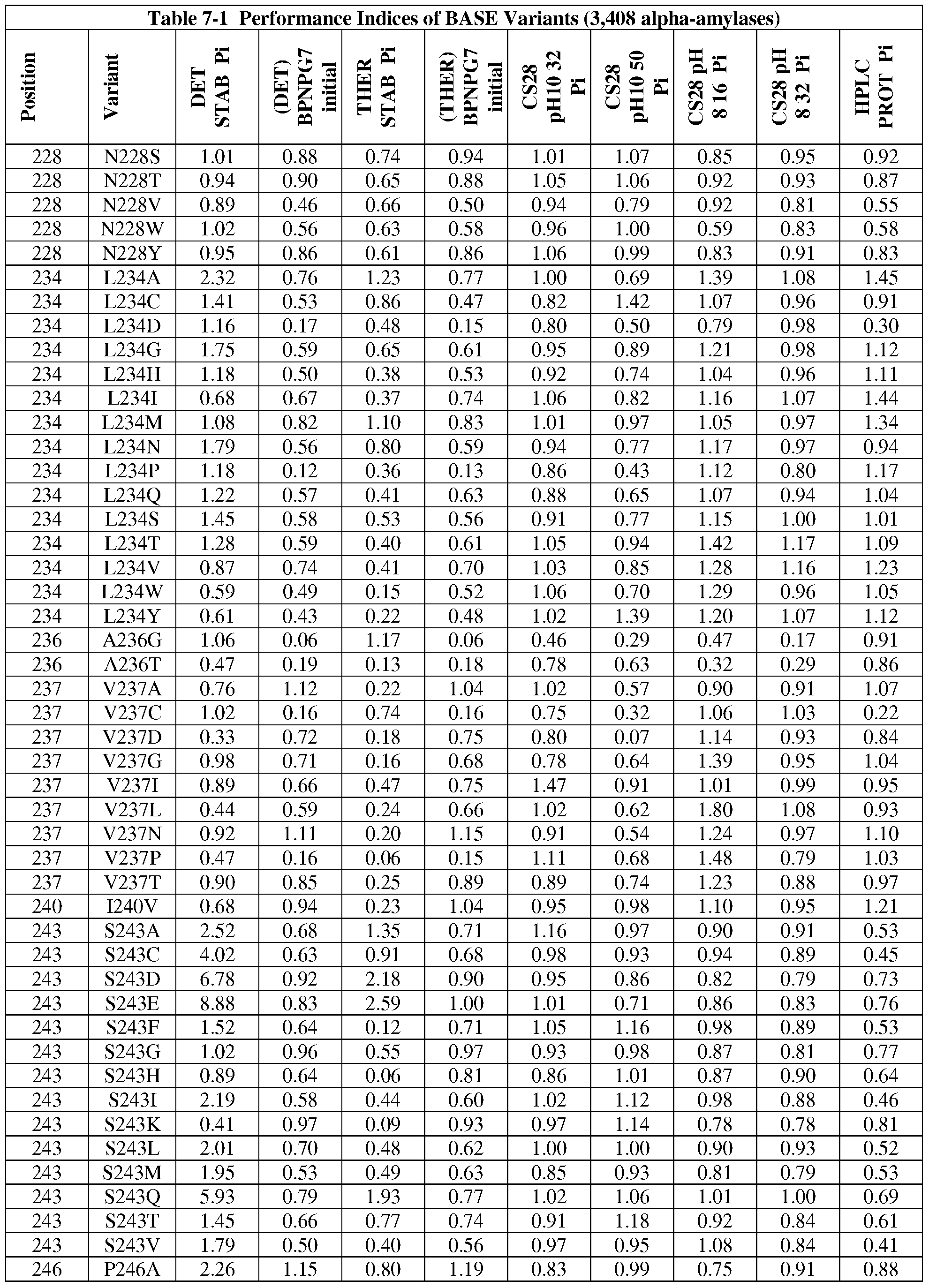 - the variant alpha-amylase comprises a substitution at one or more positions selected from the group consisting of 7, 29, 35, 53, 60, 72, 87, 108, 116, 126, 128, 129, 130, 131, 134, 136, 138, 142, 156, 161, 165, 178, 182, 185, 189, 192, 195, 197, 202, 210, 214, 217, 221, 234, 246, 269, 303, 310, 337, 340, 374, 401, and 438, and wherein the substitution of the naturally-occurring amino acid residue for a different amino acid residue, produces an alpha-amylase variant having a performance index > 1.5 for a measure of activity and a performance index > 1.0 for a measure of stability.