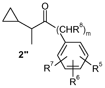 - Halocycloalkenyl and the halocycloalkenyl moieties in halocycloalkenyloxy, halocycloalkenylcarbonyl and the like monocyclic monounsaturated hydrocarbon groups having 3 to 6 (Cs-C ⁇ -halocycloalkenyl), 3 to 8 (Cs-Cs-halocycloalkenyl) or 3 to 10 (C3-Cio-halocycloalkenyl) carbon ring members (as mentioned above) in which some or all of the hydrogen atoms may be replaced by halogen atoms as mentioned above, in particular fluorine, chlorine and bromine; C3-C6-cycloalkyl-Ci-C2-alkyl: a Ci-C2-alkyl residue, as described above, wherein one of the hydrogen atoms is replaced by a Cs-C ⁇ -cycloalkyl group.