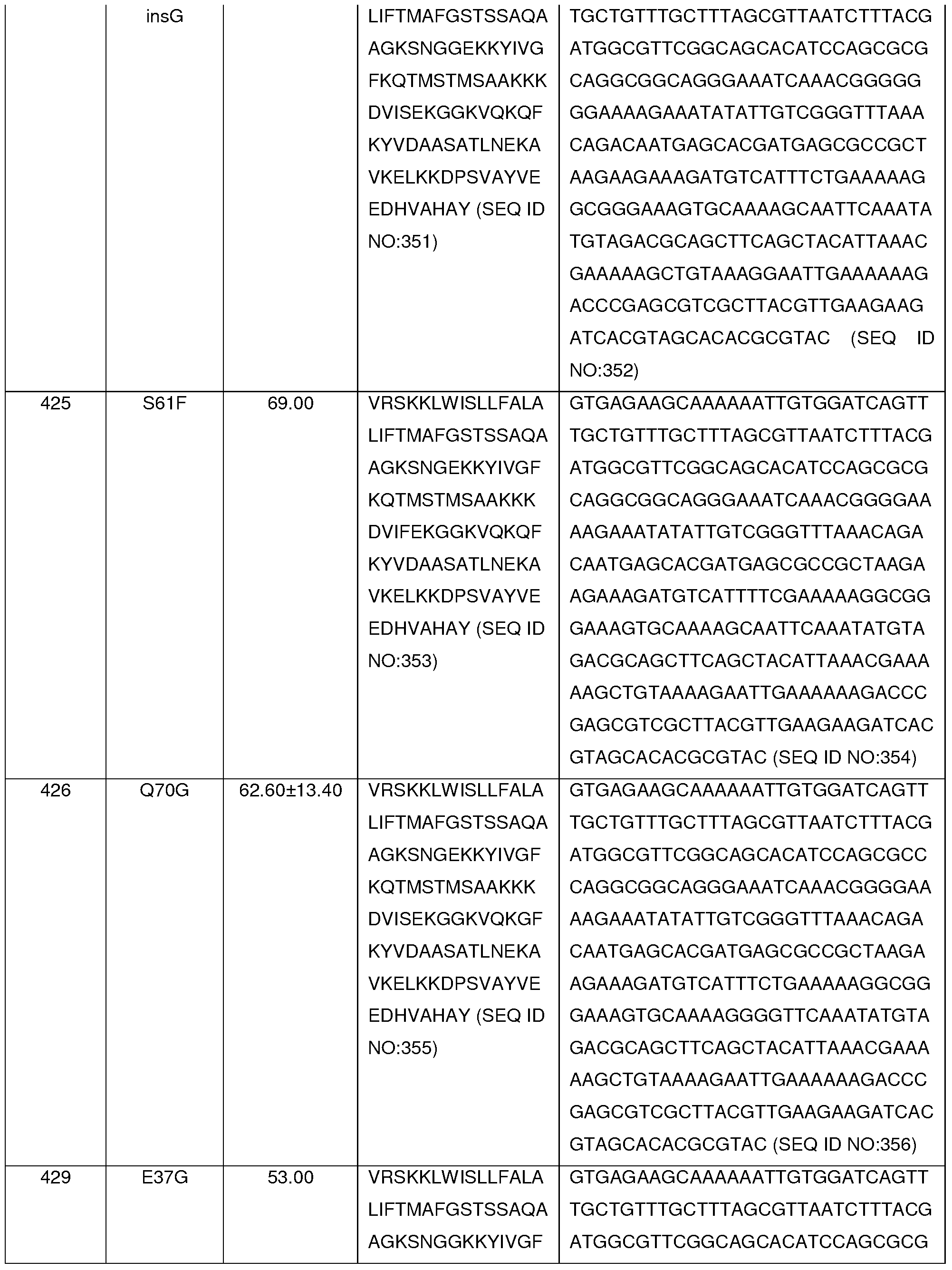 [0140] The majority of B. subtilis clones expressing a full-length FNA comprising a pre-pro polypeptide having a combination of mutations had a greater level of production of the mature FNA than clones expressing produced a full-length FNA comprising a pre-pro polypeptide having a single mutation.