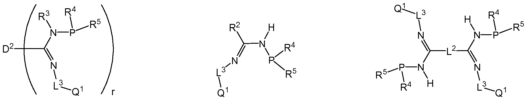 [0025] For purposes of this application, an "inert functional group" is a group which does not substantially interfere with the process described herein in which the material having an inert functional group takes part and/or does not complex with the metal compound of the metal complex. The term "does not complex with the metal compound" may include groups that could complex with a metal compound but in particular molecules described herein may not complex with a metal compound due to its positional relationship within a ligand. For example, while an ether group may complex with a metal compound, an ether group located at a para position of a substituted phenyl phosphinyl group may be an inert functional group because a single metal compound cannot complex with both the para ether group and the N2-phosphinyl amidine group of the same metal complex molecule. Thus, the inertness of a particular functional group is not only related to the functional group's inherent inability to complex the metal compound but can also be related to the functional group's position within the metal complex. Non-limiting examples of inert functional groups which do not substantially interfere with processes described herein can include halo (fluoro, chloro, bromo, and iodo), nitro, hydrocarboxy groups (e.g, alkoxy, and/or aroxy, among others), sulfidyl groups, and/or hydrocarbyl groups, among others.