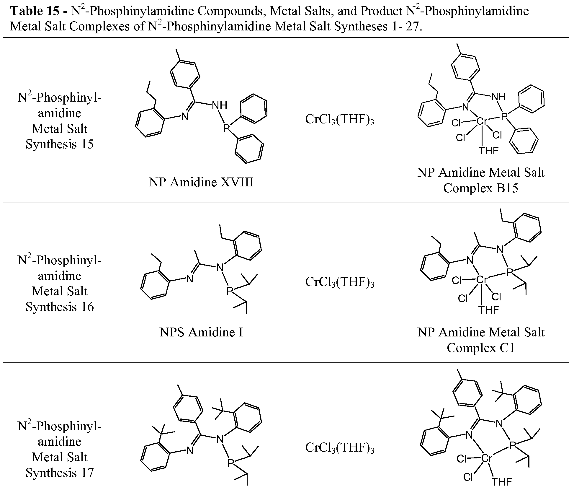 [0712] As can be seen in Table 22, N2-phosphinyl amidine metal salt complexes which had been stored for significant periods of time (Run 74, complex B5 stored for 5 months and Run 40, Complex B4, stored for 6 months) prior to preparing the catalyst system produced significant amounts of polymer (8.6 wt% and 8.8 wt%, respectively). Table 22 data also show that N2- phosphinyl amidine metal salt complexes can be treated with a neutral ligand such that the N2- phosphinyl amidine metal salt complex can then be utilized in a catalyst system which can produce less polymer. In Run 101 , the N2-phosphinyl amidine metal salt complex that was treated with the same neutral ligand as was originally present in the N2-phosphinyl amidine metal salt complex (i.e., THF), resulted in a catalyst system producing 0.6 wt% polymer. In run 202, the N2-phosphinyl amidine metal salt complex that was treated with a different neutral ligand (i.e., pyridine) than was originally present in the N2-phosphinyl amidine metal salt complex (THF), resulted in a catalyst system producing 0.6 wt% polymer.