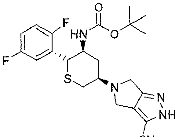 - ZUZXGKOHNXPZBX-KGYZHSKHSA-N CC(C)(C)OC(N[C@@H](C1)C(c(cc(cc2)F)c2F)SCC1N1Cc2n[nH]cc2C1)=O Chemical compound CC(C)(C)OC(N[C@@H](C1)C(c(cc(cc2)F)c2F)SCC1N1Cc2n[nH]cc2C1)=O ZUZXGKOHNXPZBX-KGYZHSKHSA-N 0.000 description 1