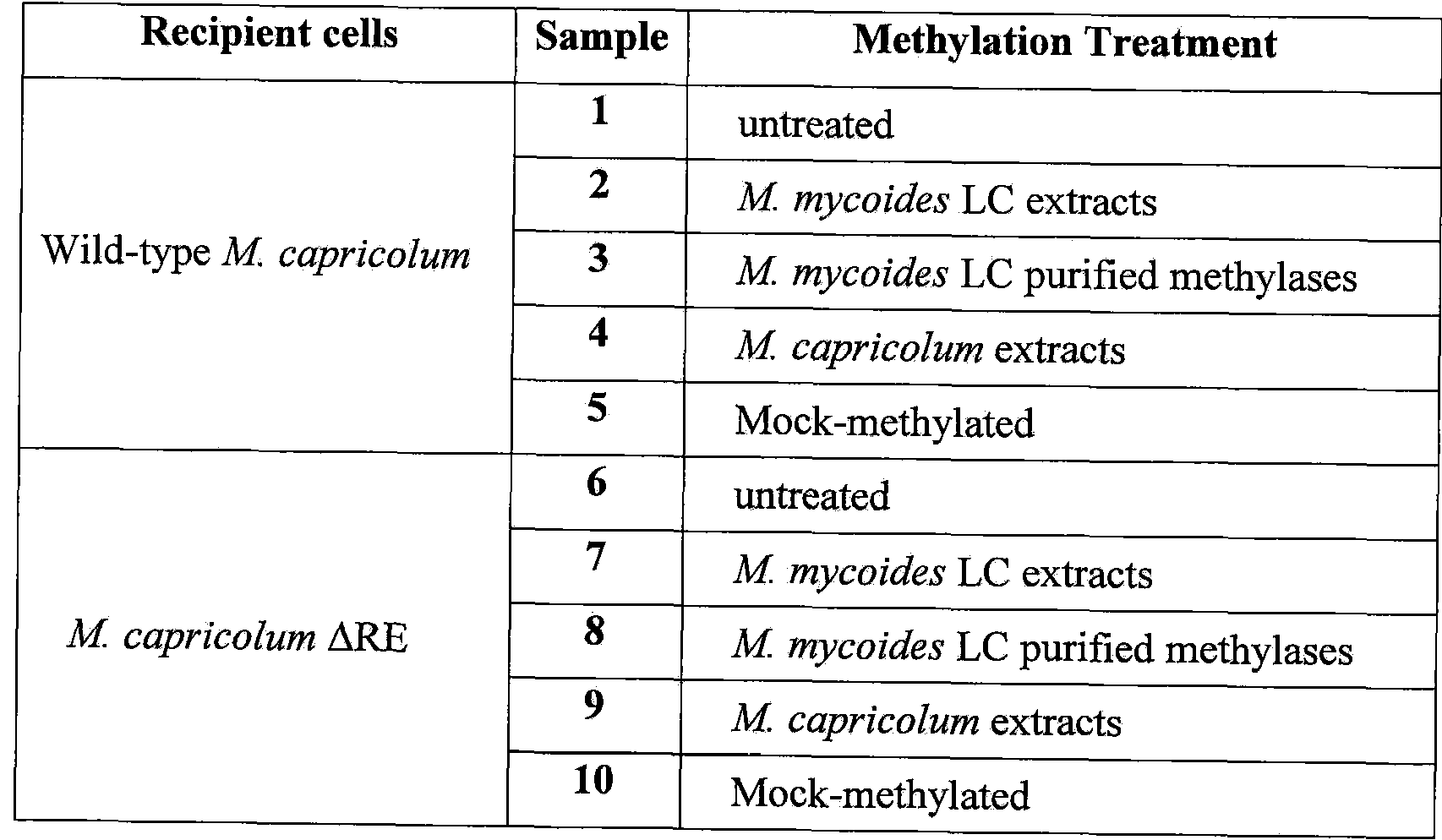 [0699] Our first successful genome transplants used native genomes isolated from intact cells. These studies proved that genomes could be successfully transplanted into related species replacing the existing genetic material and in the process converting the cell into the phenotype dictated by the new genome. These experiments proved that naked DNA could be transplanted. What we did not know at the time was that the DNA in M. mycoides cells was methylated and, therefore, protected from restriction when inserted into M. capricolum cells.