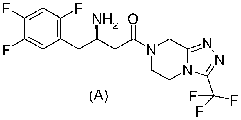 - Sitagliptin (MK-0431 ) having the structural formula A below is (3R)-3-amino-1 -[3- (trifluoromethyl)-5,6,7,8-tetrahydro-5H-[1 ,2,4]triazolo[4,3-a]pyrazin-7-yl]-4-(2,4,5- trifluorophenyl)butan-1 -one, also named (2R)-4-oxo-4-[3-(trifluoromethyl)-5,6- dihydro[1 ,2,4]triazolo[4,3-a]pyrazin-7(8/-/)-yl]-1 -(2,4,5-trifluorophenyl)butan-2-amine,