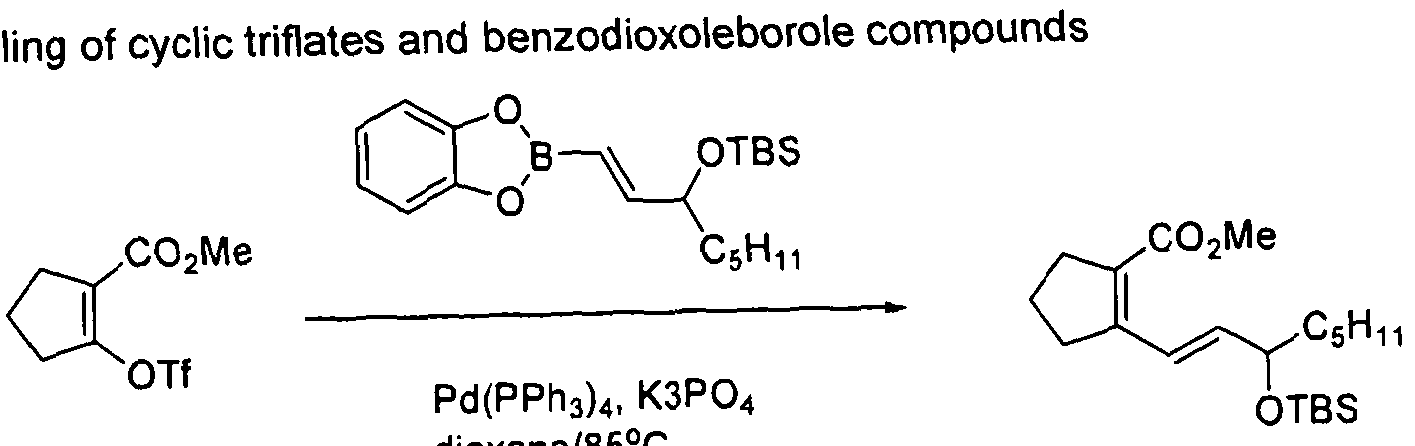 Suzuki couplings may also be used to cross couple alkenyl boron species. Suzuki and co workers have demonstrated (Suzuki et al., Synlett 1990, 221; J Org Chem 1993, 58, 2201) the coupling of cyclic trifla le compounds