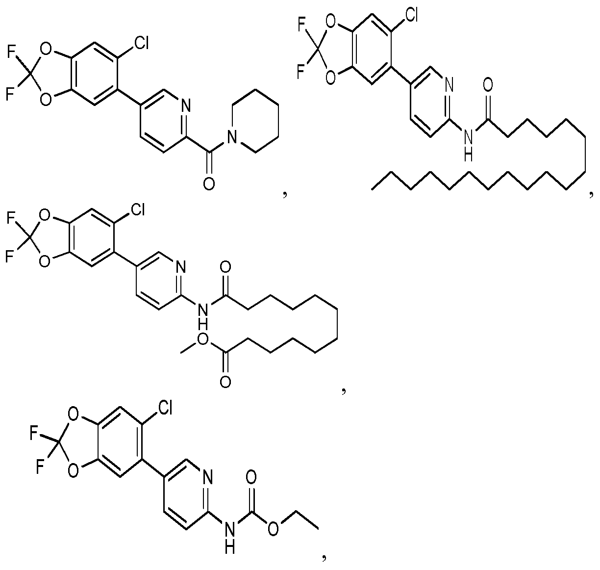 - ZVDGSUWASFMBBA-UHFFFAOYSA-N O=C(c(nc1)ccc1-c(c(Cl)c1)cc(O2)c1OC2(F)F)Nc(cccc1)c1Cl Chemical compound O=C(c(nc1)ccc1-c(c(Cl)c1)cc(O2)c1OC2(F)F)Nc(cccc1)c1Cl ZVDGSUWASFMBBA-UHFFFAOYSA-N 0.000 description 1