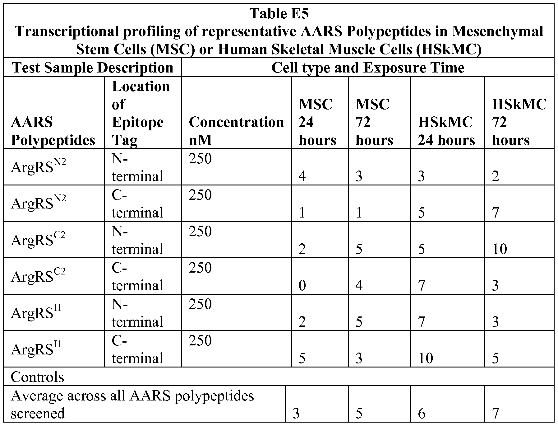[00625] To test for the ability of the AARS polypeptides to modulate gene expression, selected AARS polypeptides were incubated with mesenchymal stem cells or human skeletal muscle cells for the times and at the concentrations shown in Table E5.