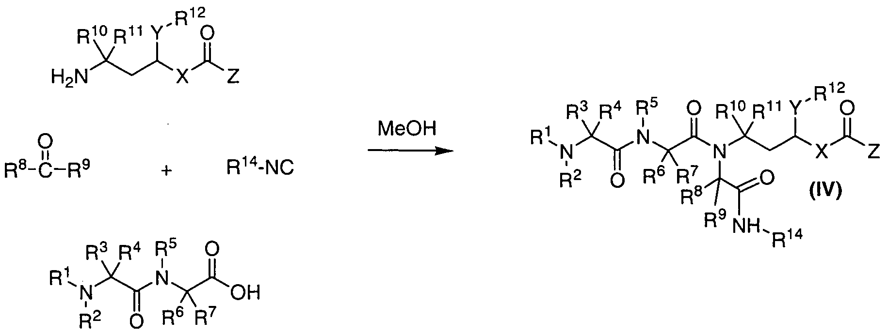 - the present invention is also directed to a method of producing compounds having the general formula (IV) by an Ugi-type reaction for the generation of the tertiary amide bond (see Figure 1 ) wherein