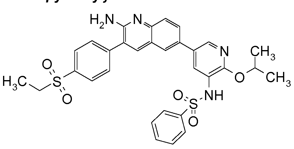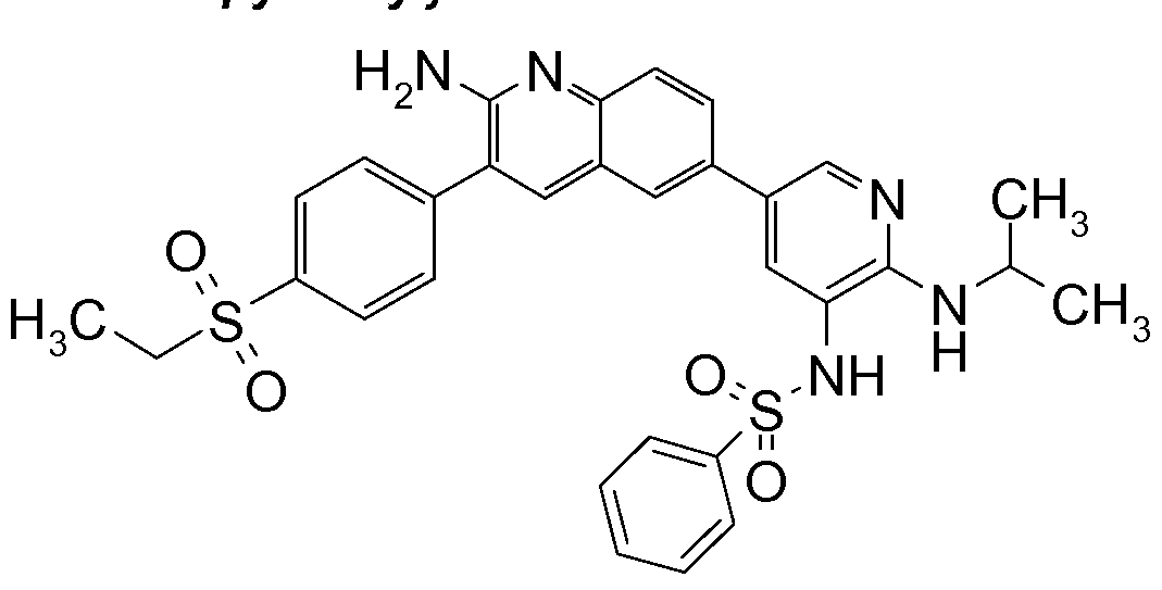 - TYEJPGIXQPMOER-UHFFFAOYSA-N CCS(c(cc1)ccc1-c1cc(cc(cc2)-c(cc3NS(c4ccccc4)(=O)=O)cnc3NC(C)C)c2nc1N)(=O)=O Chemical compound CCS(c(cc1)ccc1-c1cc(cc(cc2)-c(cc3NS(c4ccccc4)(=O)=O)cnc3NC(C)C)c2nc1N)(=O)=O TYEJPGIXQPMOER-UHFFFAOYSA-N 0.000 description 1