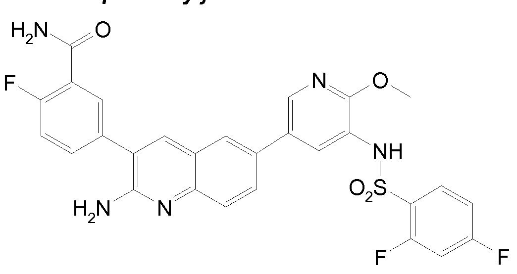 - DXMWGJULQVBMMD-UHFFFAOYSA-N CNC(c(c(Cl)c1)ccc1-c1c(N)nc(ccc(-c(cc2NS(c(ccc(F)c3)c3F)(=O)=O)cnc2OC)c2)c2c1)=O Chemical compound CNC(c(c(Cl)c1)ccc1-c1c(N)nc(ccc(-c(cc2NS(c(ccc(F)c3)c3F)(=O)=O)cnc2OC)c2)c2c1)=O DXMWGJULQVBMMD-UHFFFAOYSA-N 0.000 description 1