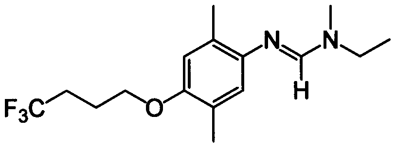 To 4 ml of water, 2.0 g of iron powder, 1.9 g of 4,4- dimethyl- (2, 5-dimethyl-4-nitrophenoxy) pentan-2-one and 28 ml of acetic acid were added at room temperature, and stirred at 80°C for 1 hour and 30 minutes. The reaction mixture was allowed to stand and cooled to about room temperature, then filtered through Celite®. The filterate was concentrated under reduced pressure. The resulting residue was subjected to silica gel column chromatography and high performance liquid chromatography successively to obtain 0.38 g of 4, 4, 4-trifluoro- (4-amino-2, 5- dimethylphenoxy) butan-2-yne .
