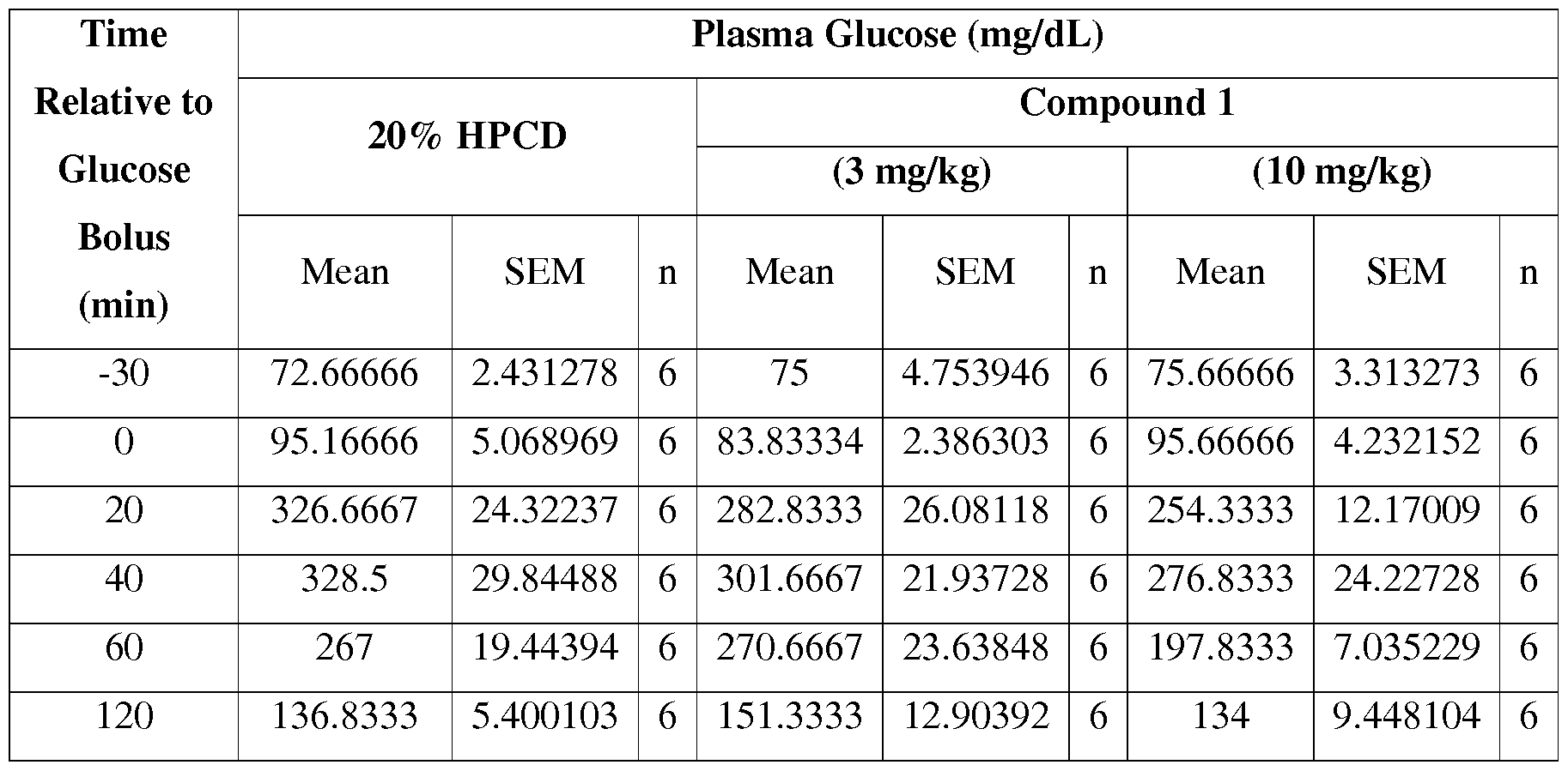 Male 129SVE mice (approximately 8 weeks old) were fasted for 18 h and randomly grouped (n = 6) to receive a GPR119 agonist (Compound 1) at 3, 10, or 30 mg/kg body weight. The compound was delivered orally via a gavage needle (4 mL/kg) 30 min prior to glucose bolus (3g/kg) (time = -30 min in Figure 1), with a separate control group receiving vehicle (20% hydroxypropyl-beta-cyclodextrin (HPCD). At time 0 min, the glucose bolus was administered. Levels of blood glucose were assessed using a glucometer (One-Touch Ultra™, LifeScan) at time -30 min (prior to compound administration), at 0 min (at time when glucose bolus was given), and at 20, 40, 60, 120 min post glucose bolus. The plasma glucose level (Table A) and
