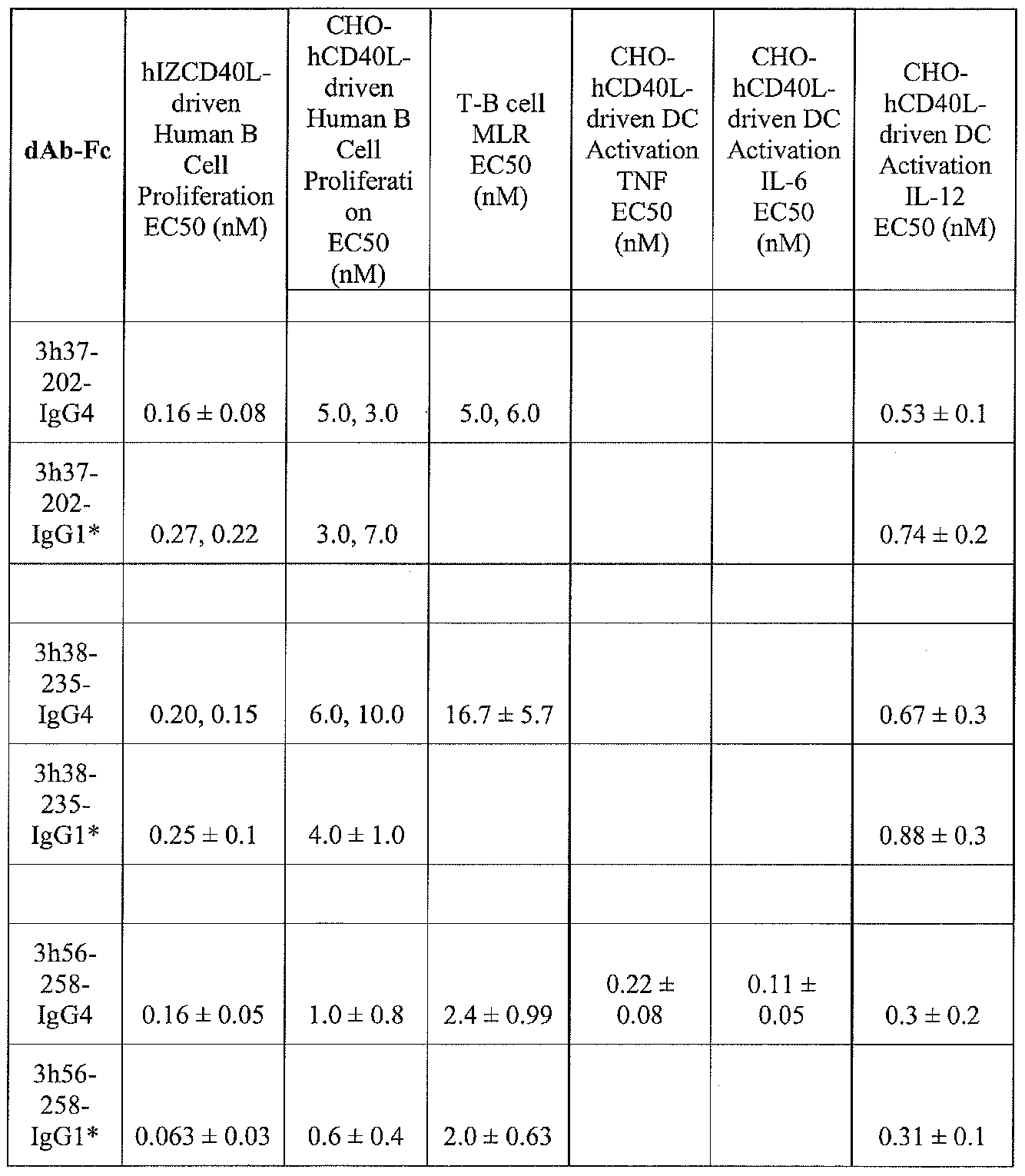 CD40 Fc Fusion Polypeptide Acitivity Assays Anti-human CD40 Fc Fusion Polypeptides were assayed functionally for their ability to antagonize CD40 activities. The CD40 activities tested were B cell proliferation and cytokine production by hCD40L-driven activation of primary human monocyte-derived dendritic cells (DCs). B cell proliferation and cytokine production were measured using the assays disclosed in Example 6. Unless otherwise noted, all assays were performed in RPMI media supplemented with 10% fetal calf serum (FCS). The dAb-Fc domain fusion polypeptides exhibited potent inhibition (i.e., antagonism) of CD40-dependent activation. There were no agonistic properties noted among any of the humanCD40-specific dAb-Fc domain fusion polypeptides. The results using the various assays are shown in TABLE 29. 3h56-269-IgG4 was assayed for its binding to immobilized human-CD40 using the assays disclosed in Example 11. For 3h56-269-