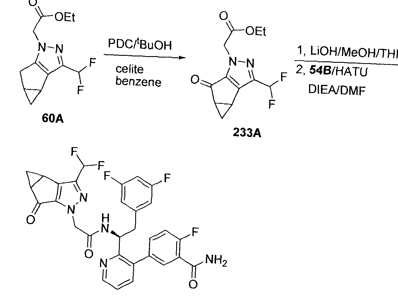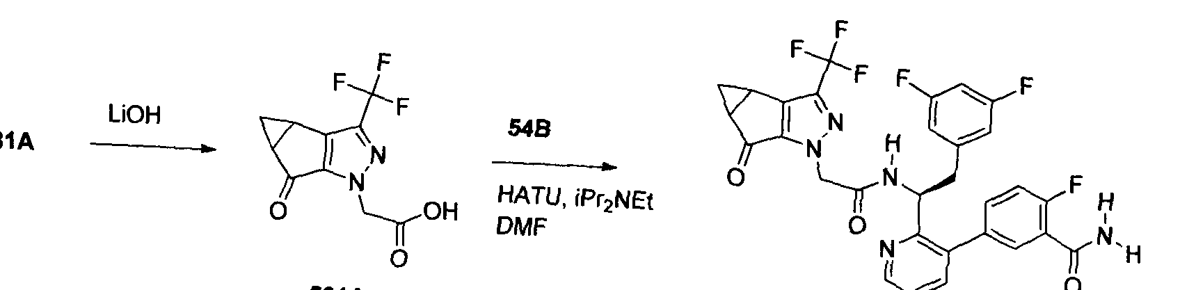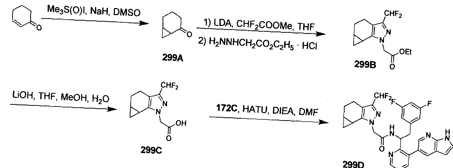 Synthesis of N-((S)-l-(3-(IH-pyrrolo[2,3-b]pyridin-5-yl)pyridin-2-yl)-2-(3,5- difluorophenyl)ethyl)-2-(3-(trifluoromethyl)-3b,4,4a,5-tetrahydro-lH- cyclopropa[3,4]cyclopenta[l,2-c]pyrazol-l-yl)acetamide (595):