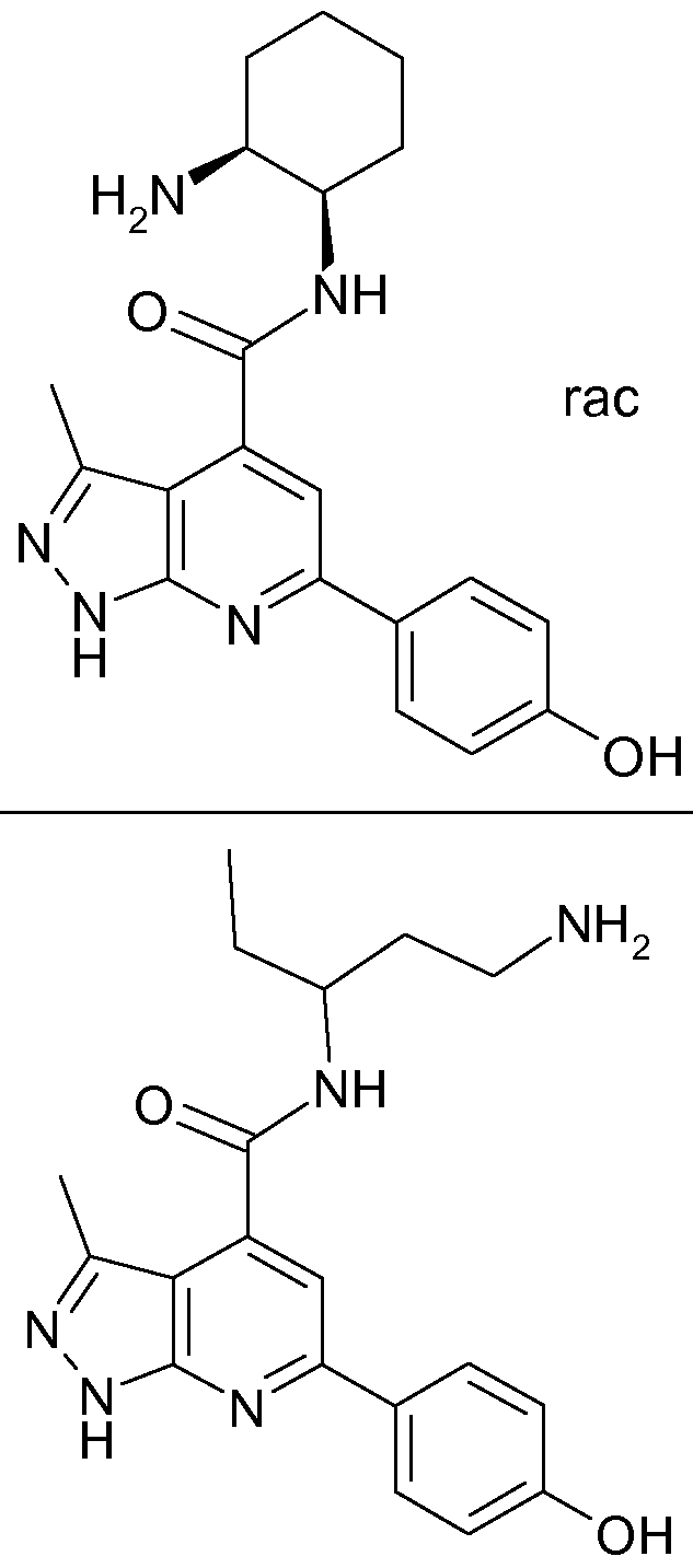 9517182), Midostaurin (e.g. EP 2961 10) or Sotrastaurin (e.g. WO 2002038561 ). Only very few PKCd inhibitors, which are not derived from staurosporine have been described, such as 3-amido-pyrrolo[3,4-c]pyrazole-5(1 H, 4H,6H)carbaldehydes in WO 2008125945. However, there continues to be a need for further effective low molecular weight PKCd inhibitors, in particular in view of safety and selectivity. The present invention satisfies this need by providing the pyrazolo[3,4-b]pyridine compounds of the formula I. Pyrazolo[3,4-b]pyridine derivatives which are useful for pharmaceutical applications, have already been disclosed, for example in WO 2005028480 (Neurogen Corp. and
