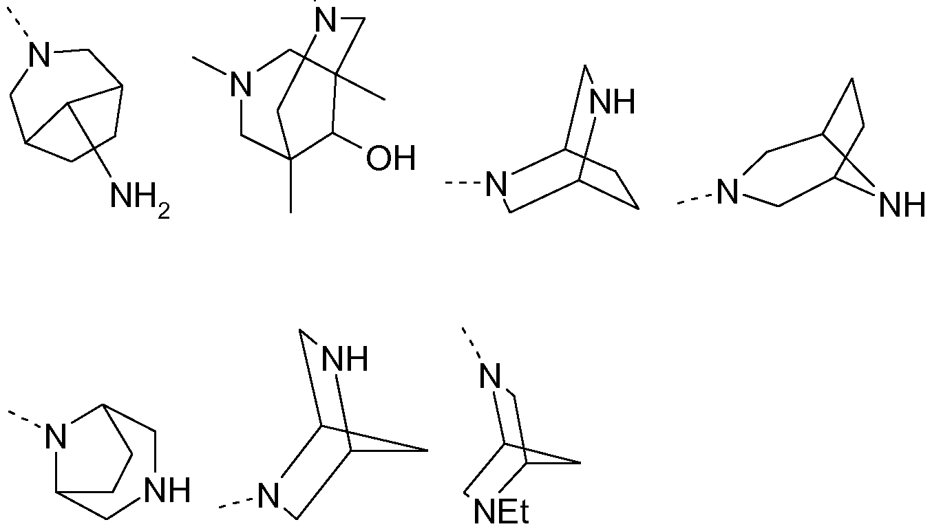 a brigded bicyclic (C7-C9)-heterocycloalkyl group containing one nitrogen atom, which is attached via a carbon atom and which is unsubstituted or substituted by one or two identical or different substituents selected from the group consisting of F and (Ci-C4)-alkyl, which is unsubstituted or one to fivefold substituted by F; or