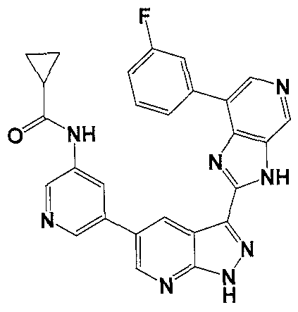 - ULWIWKNRZYQIBH-UHFFFAOYSA-N CN1CCN(Cc2cc(-c3cncc4c3nc(-c3n[nH]c(nc5)c3cc5-c3cnccc3)[nH]4)cc(F)c2)CC1 Chemical compound CN1CCN(Cc2cc(-c3cncc4c3nc(-c3n[nH]c(nc5)c3cc5-c3cnccc3)[nH]4)cc(F)c2)CC1 ULWIWKNRZYQIBH-UHFFFAOYSA-N 0.000 description 1