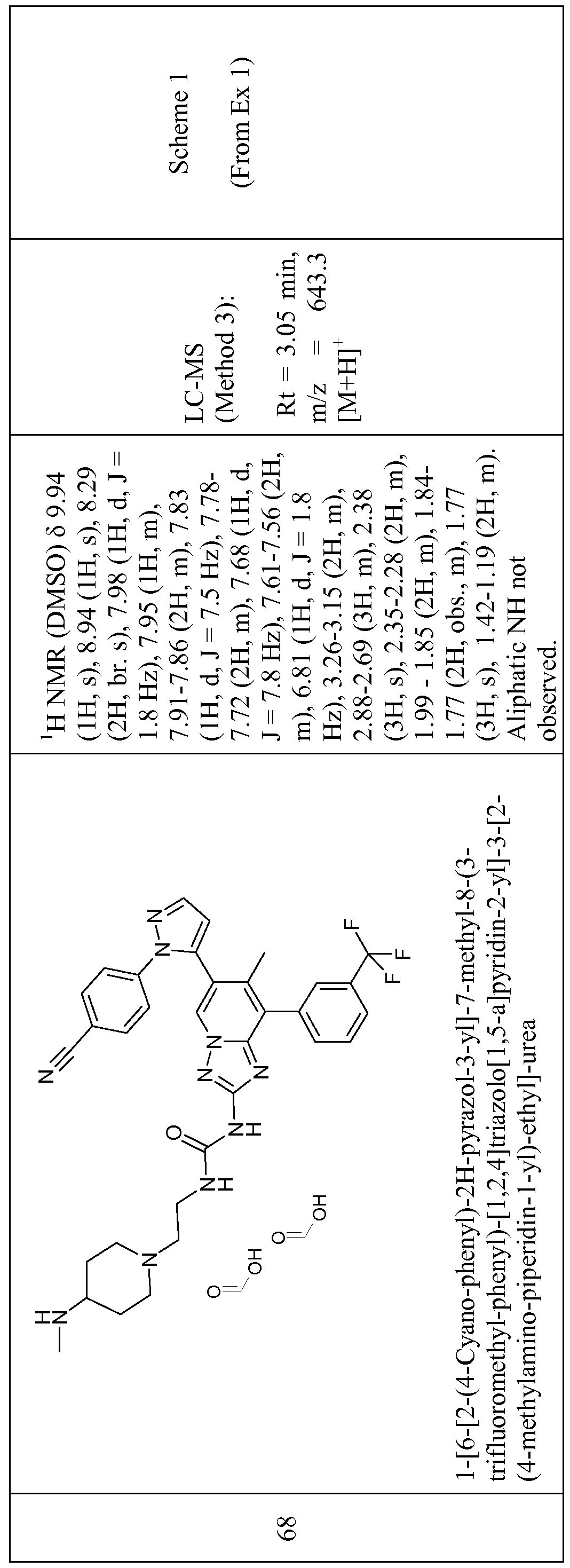 The title compound was prepared from l-[6-[2-(4-cyano-phenyl)-2H- pyrazol-3-yl]-7-methyl-8-(3-trifluoromethyl-phenyl)-[ 1 ,2,4]triazolo[ 1 ,5-a]pyridin- 2-yl]-3-piperidin-4-yl-urea (Ex. 50, 50 mg, 0.085 mmol) and methane sulfonyl chloride (7.9