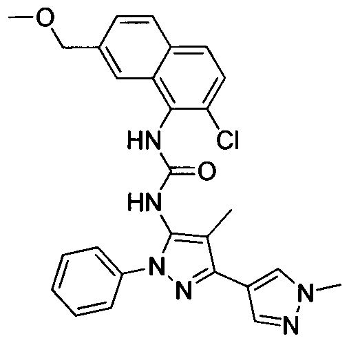 - FJBLFGJOTOLMTH-UHFFFAOYSA-N Cc1c(NC(Nc(nc2)c(cccc3)c3c2Cl)=O)[n](-c2ccccc2)nc1-c1c[n](C)nc1 Chemical compound Cc1c(NC(Nc(nc2)c(cccc3)c3c2Cl)=O)[n](-c2ccccc2)nc1-c1c[n](C)nc1 FJBLFGJOTOLMTH-UHFFFAOYSA-N 0.000 description 1
