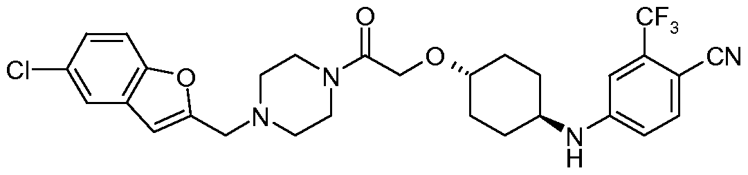 - MWDIAYHJRPMWCL-FBSWEULCSA-N [O-][N+](c(cc1)c(C(F)(F)F)cc1N[C@H](CC1)CC[C@@H]1OCC(N1CCN(Cc2cc3cc(-c4ccc(C(F)(F)F)cc4)ccc3[o]2)CC1)=O)=O Chemical compound [O-][N+](c(cc1)c(C(F)(F)F)cc1N[C@H](CC1)CC[C@@H]1OCC(N1CCN(Cc2cc3cc(-c4ccc(C(F)(F)F)cc4)ccc3[o]2)CC1)=O)=O MWDIAYHJRPMWCL-FBSWEULCSA-N 0.000 description 1