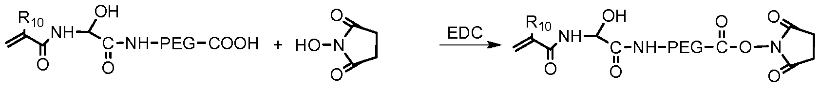 diamido linkage (-C(0)NH-alkylene-C(0)NR'- with R' as defined above); an amino group - NHR' reacts with a carboxylic acid group in the presence of a coupling agent - carbodiimide (e.g., 1 -ethyl-3-(3-dimethylaminopropyl) carbodiimide (EDC), N,N'-dicyclohexylcarbodiimide (DCC), 1 -cylcohexyl-3-(2-morpholinoethyl)carbodiimide, diisopropyl carbodiimide, or mixtures thereof) to form an amide linkage; an amino group -NHR' reacts with a N- hydroxysuccinimide ester group to form an amide linkage; a hydroxyl reacts with an isocyanate to form a urethane linkage; a hydroxyl reacts with an epoxy or aziridine to form an ether linkage (-0-); a hydroxyl reacts with an acid chloride or bromide group or with an acid anhydride group to form an ester linkage; an hydroxyl group reacts with an azlactone group in the presence of a catalyst to form an amidoalkylenecarboxy linkage (-C(O)NH- alkylene-C(O)-O-); a carboxyl group reacts with an epoxy group to form an ester bond; a thiol group (-SH) reacts with an isocyanate to form a thiocarbamate linkage (-N-C(O)-S-); a thiol group reacts with an epoxy or aziridine to form a thioether linkage (-S-); a thiol group reacts with an acid chloride or bromide group or with an acid anhydride group to form a thiolester linkage; a thiol group reacts with an azlactone group in the presence of a catalyst to form a linkage (-C(0)NH-CR3R4-(CH2)p-C(0)-S-). A thiol group reacts with a vinyl group based on thiol-ene reaction under thiol-ene reaction conditions to form a thioether linakge (- S-). A thiol group reacts with an acryloyl or methacryloyl group based on Michael Addition under appropriate reaction conditions to form a thioether linkage.