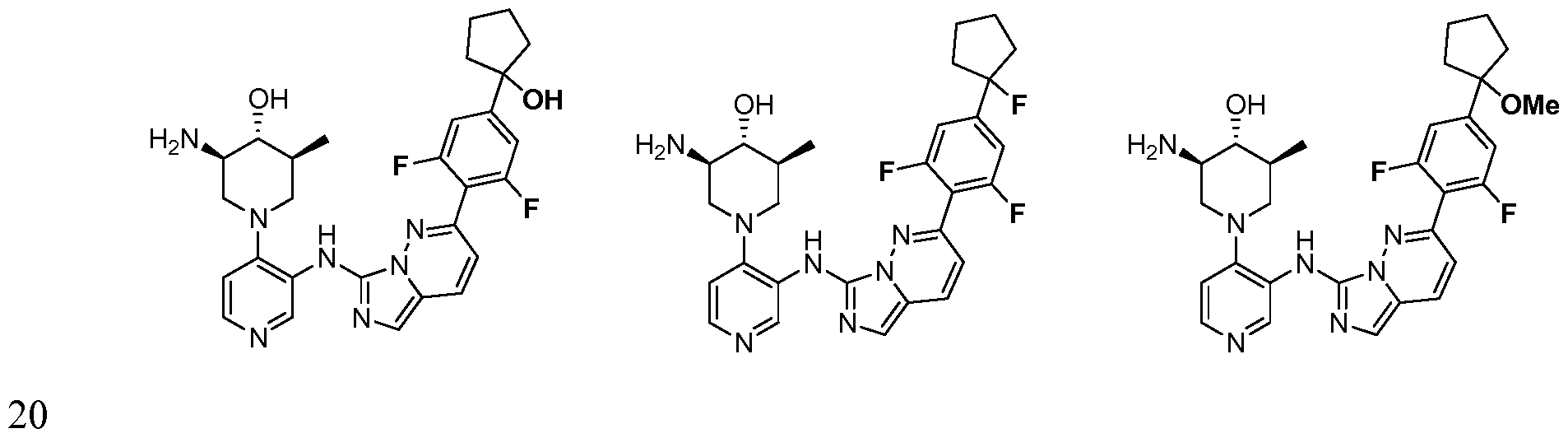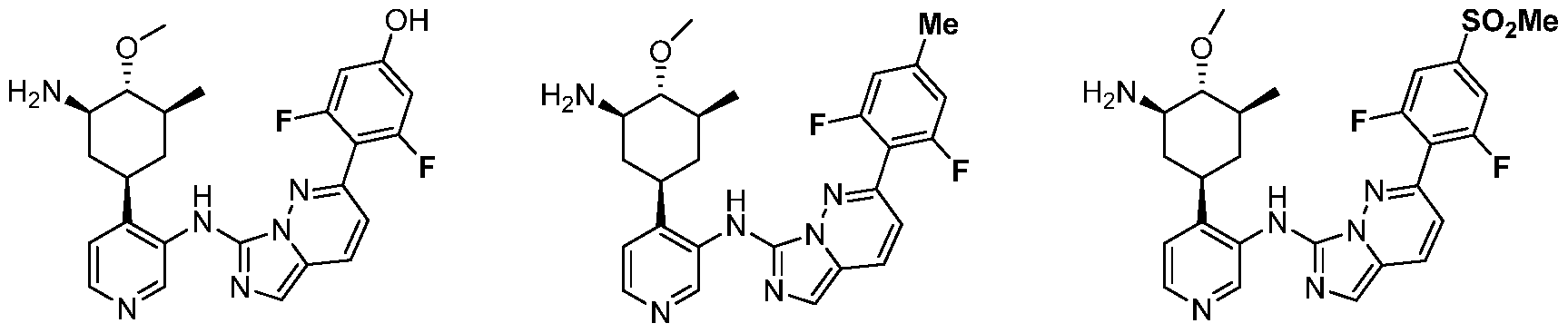 To a solution of (lR,2R,4R,6S)-2-((tert-butoxycarbonyl)amino)-4-(3-((2- chloroimidazo[ 1 ,5-b]pyridazin-7-yl)amino)pyridin-4-yl)-6-methylcyclohexyl acetate (1.0 equiv.) in THF/H20 (10: 1, 0.1 M) is added 2-(2,6-difiuoro-4-(2-methoxyethoxy)phenyl)- 4,4,5,5-tetramethyl-l,3,2-dioxaborolane (2.5 equiv.) and KF (3.3 equiv.). The solution is degassed with Argon, Pd2(dba)3 (0.25 equiv.) and t-Bu3P (0.5 equiv.) is added and the solution is heated at 90 °C for 12 hours. The reaction is cooled to rt, the volatiles are removed in vacuo and the residue is purified by ISCO Si02 chromatography to yield the O-Acetyl, N-Boc protected product. The acetyl group is deprotected by treating with K2C03 (2.0 equiv.) in ethanol (0.1 M concentration) for 24 hours at rt or for 3 hours at 65 °C. Upon cooling to rt, filterering, and removal of the volatiles in vacuo, the Boc group is removed by treating with 25% TFA/CH2C12 for 1 hour. Upon removal of the volatiles in vacuo and purification by RP-HPLC yields (3R,4R,5S)-3-amino-l-(3-((2-(2,6-difluoro- 4-isopropoxyphenyl)imidazo[l,5-b]pyridazin-7-yl)amino)pyridin-4-yl)-5- methylpiperidin-4-ol as the TFA salt.