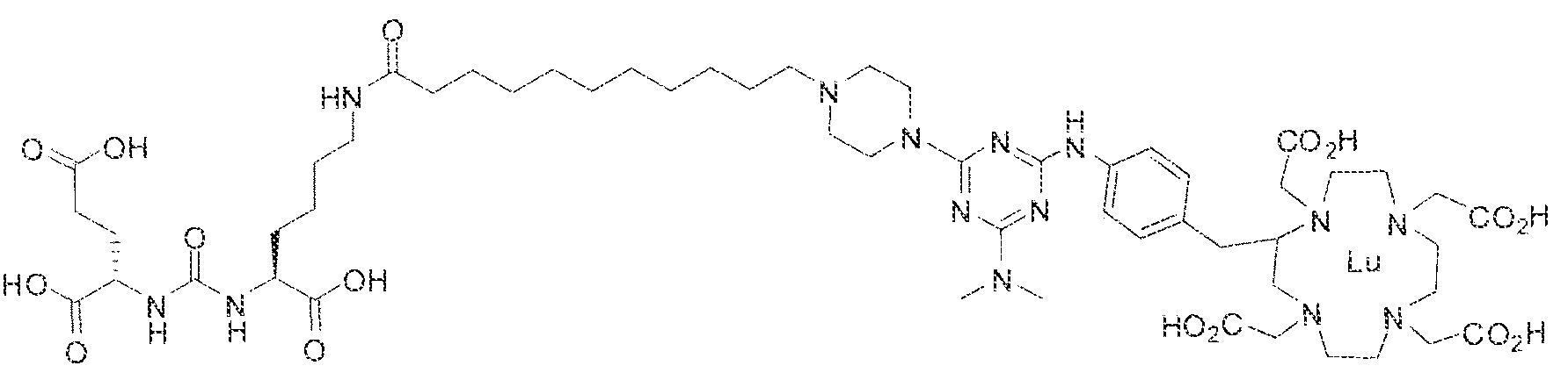 - the present invention relates to compounds having a PSMA targeting moiety linked to a radionuclide chelating group as well as radionuclide complexes of the inventive compounds. More specifically, the present technology is focued on the synthesis and use of compounds that conform to the general structure [PSMA recognition motif]-iinker- [radionucltde chelating group] and radionuclide complexes of the inventive compounds. As further described below, the inventive compounds and their radionuclide complexes comprise a 1 .3,5-triazine moiety within the linker.
