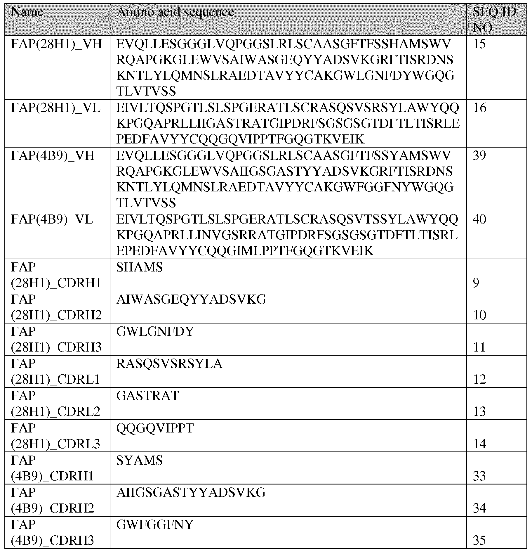 and at least one antigen binding site specific for FAP comprising a variable heavy chain comprising an amino acid sequence of SEQ ID NO.:15 and SEQ ID NO.:39 ; and a variable light chain comprising an amino acid sequence of SEQ ID NO.:16 and SEQ ID NO.:40.