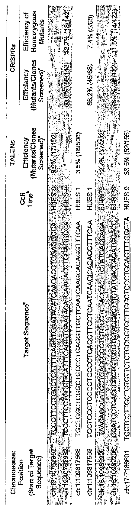 [0702] gRNAs were designed matching G(N)1 NGG sequences in seven loci in six genes (AKT2, CELSR2, CIITA, GLUT4, LINC00116, and SORT1) previously successfully targeted with TALENs (Ding et al., Cell Stem Cell 12:238-251 (2013)) and one additional locus in LDLR. In this system, CRISPRs consistently and substantially outperformed TALENs across loci and hPSC lines (see Table SI). The TALENs yielded clones with at least one mutant allele at efficiencies of 0%-34%, but matched CRISPRs