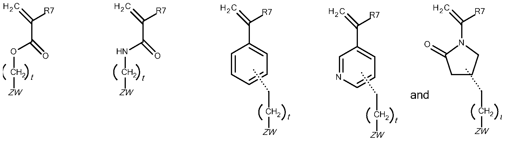 [00020] The present invention provides high molecular weight (MW) polymers having hydrophilic groups or zwitterions, such as phosphorylcholine. Also provided in accordance with the present invention are methods and novel starting materials for making the high MW polymers. Also provided in accordance with the present invention are conjugates of the high MW polymers and functional agent (as defined herein).