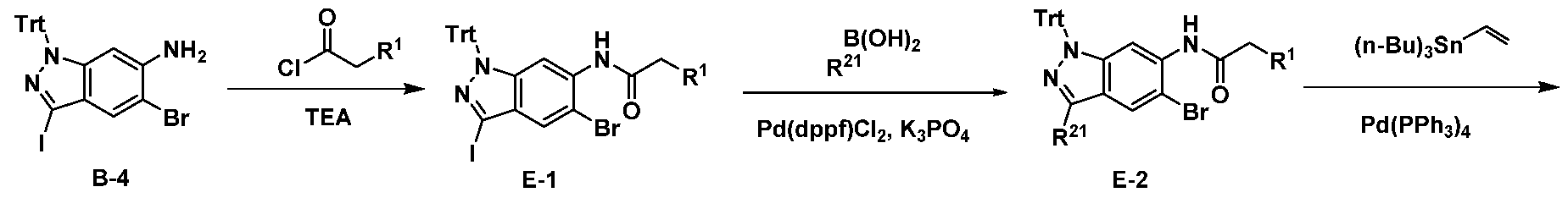[1308] 6-nitro-l-trityl-5-vinyl-lH-indazole To a mixture of 5-bromo-6-nitro-l-trityl-lH-indazole (9g, 18.6mmol) and Pd(pph3)4 (2.15g, 1.86mmol ) in toluene ( 60mL), Tributyl(vinyl)tin (7g, 22.32mmol ) was added .The resulting mixture was degassed and back-filled with argon three times and then stirred at 115 °C for 4 h. The mixture was allowed to cool to room temperature. The solution was poured into water (100 mL) and extracted with EA ( 300 mL ) three times. The organic layer was washed with brine two times, dried over Na2S04, and concentracted in vacuo. The residue was purified by flash column chromatography on silica gel to afford the desired product 6-nitro-l-trityl-5 -vinyl- IH-indazole (6.8g, 85% yield) as a white solid.