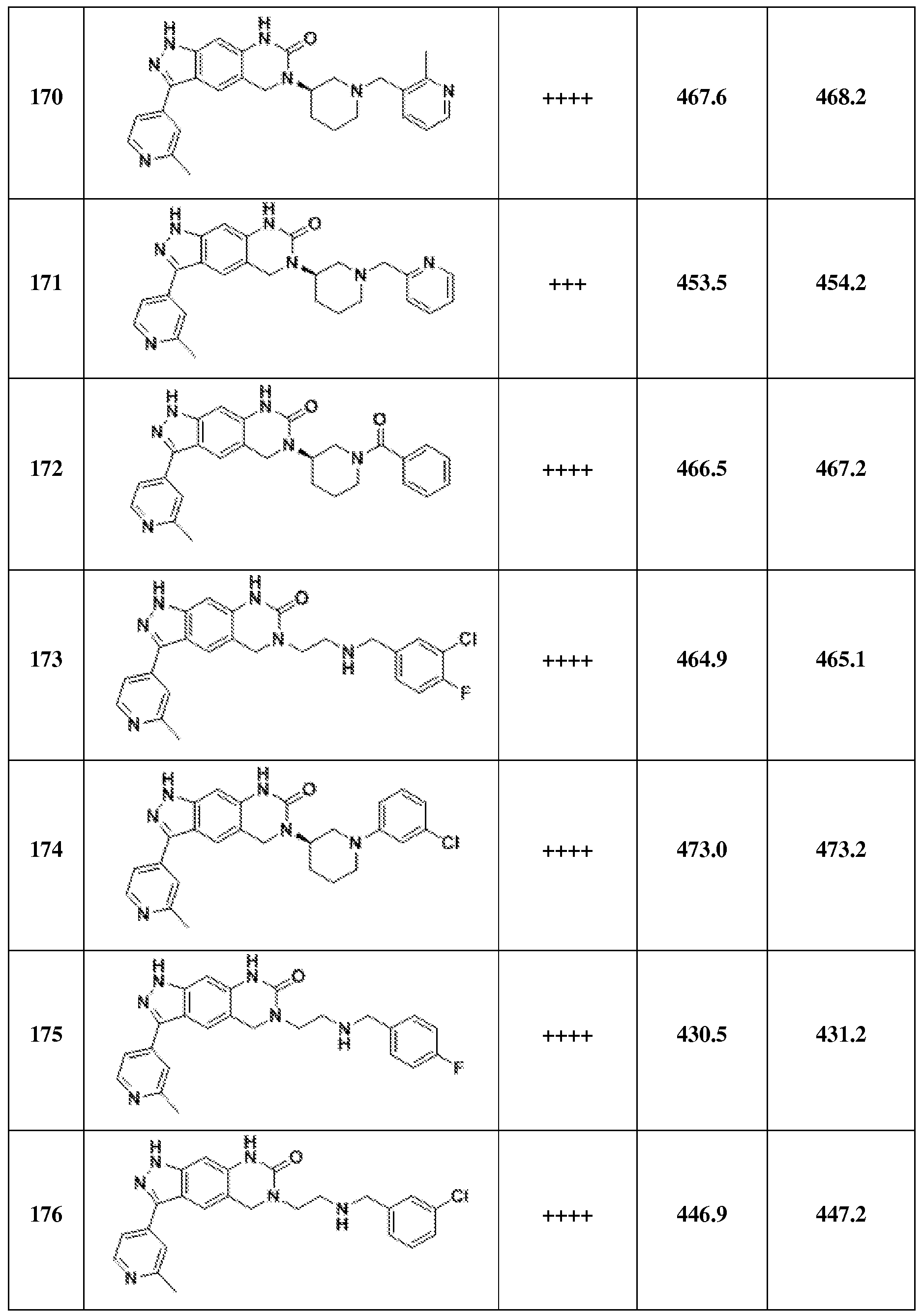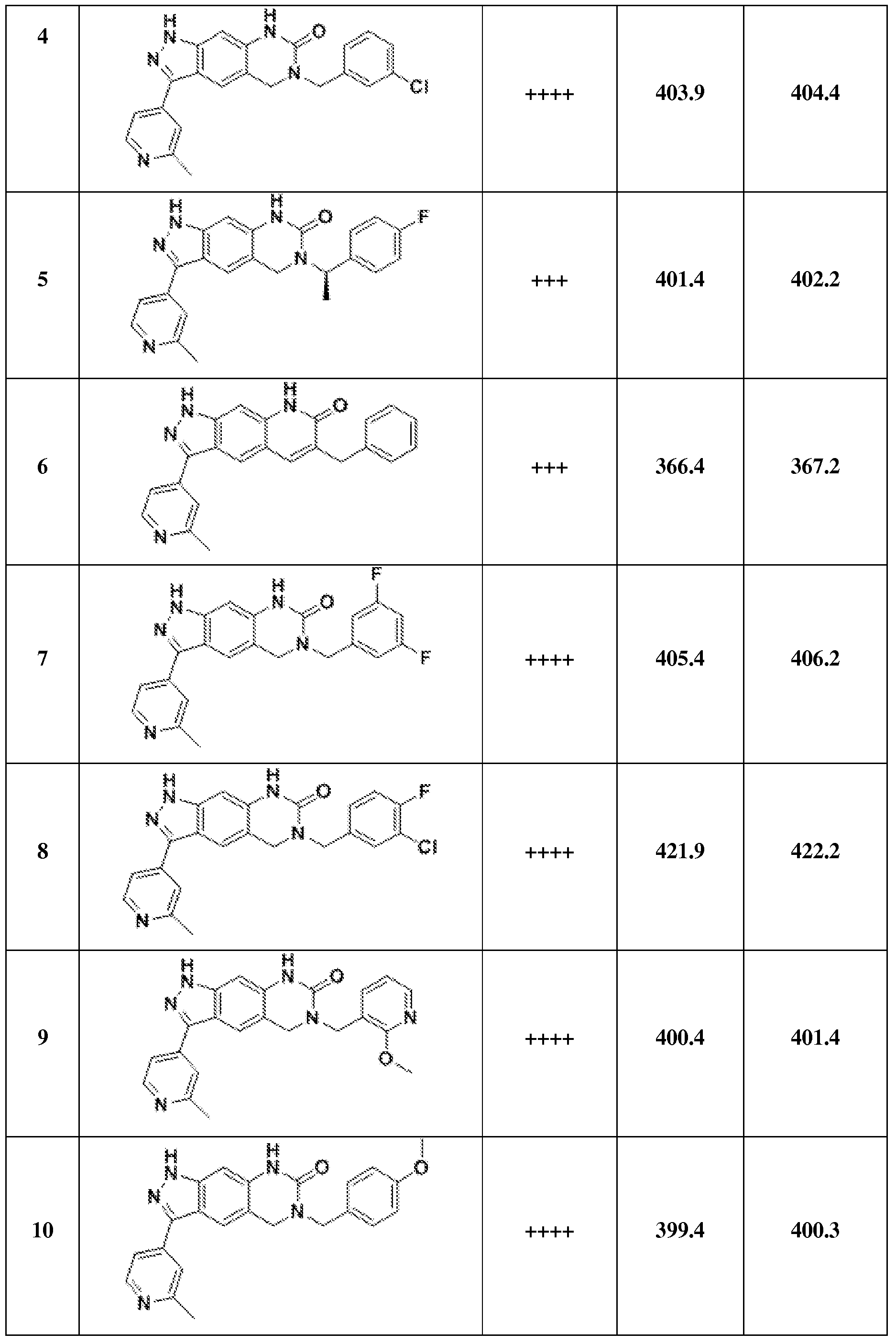 [1344] To a stirred solution of 6-(3-chloro-4-fluorobenzyl)-3-(2-methylpyridin-4-yl)-l,5,6,8-tetrahydro- 7H-pyrazolo[4,3-g]quinazolin-7-one (8 mg, 0.02 mmol) in 2 mL of DMSO at room temperature was added KMn04 (63 mg, 0.40 mmol). The reaction mixture was stirred at 60 °C for 2 h. Solid was filtered off and the resulting DMSO solution was subjected to prep-HPLC purification to give the desired product (2.5 mg 30%). XH NMR (500 MHz, DMSO-i/6) δ: 13.71 (br, IH), 11.60 (br, IH), 8.74 (s, IH), 8.59 (d, / = 5.0 Hz, IH), 7.83 (s, IH), 7.78 (d, / = 5.5 Hz, IH), 7.58 (dd, / = 2.0, 7.0 Hz, IH), 7.36-7.39 (m, 2H), 7.28 (s, IH), 5.10 (s, 2H), 2.54 (s, 3H). ESI-MS m/z : 435.1.