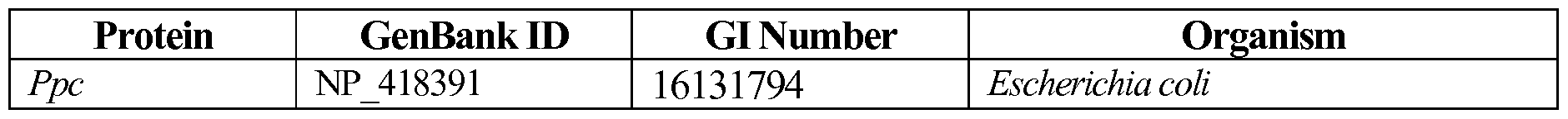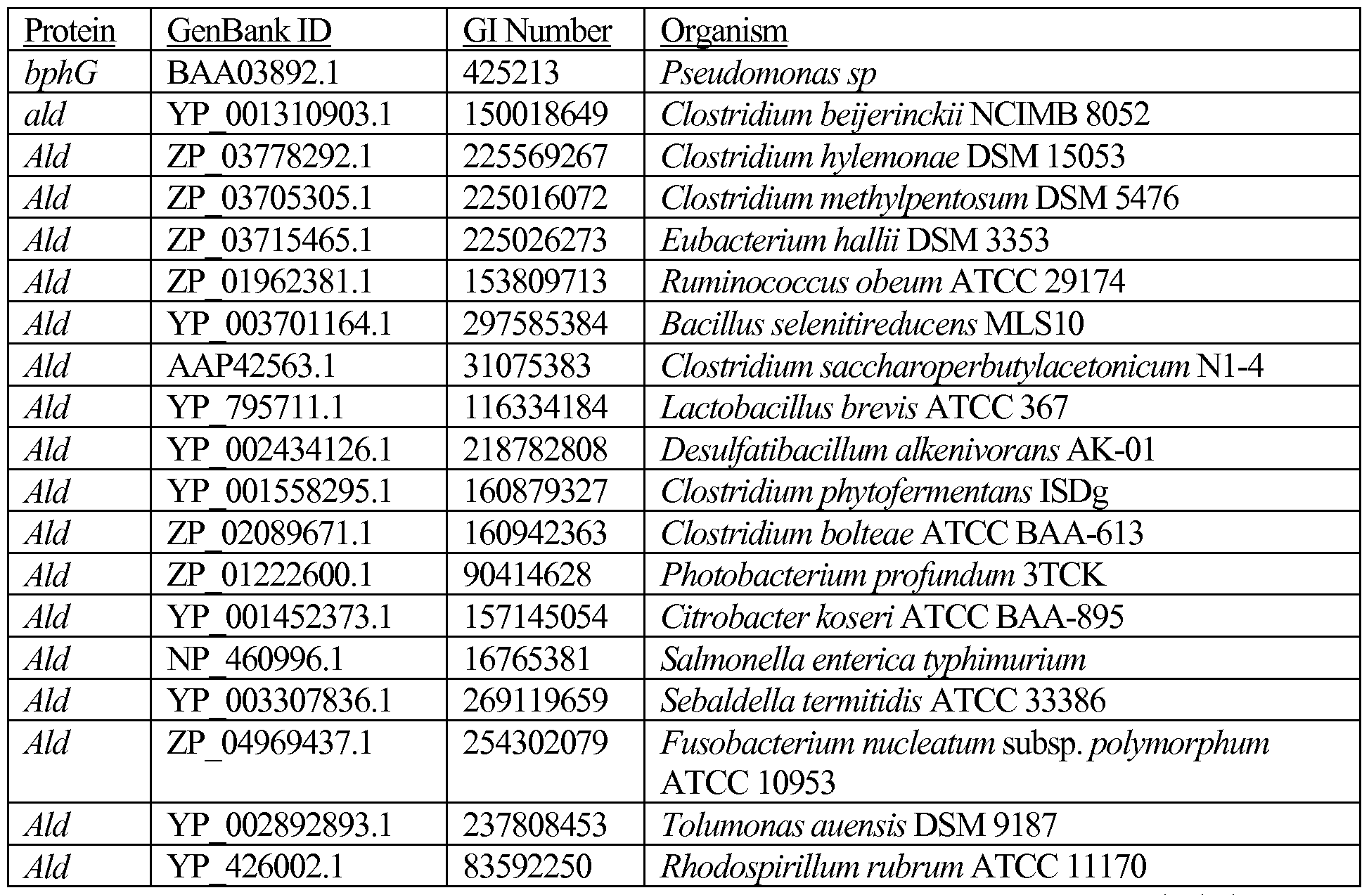 Other native candidate genes include those in the table below. The protein sequences for each of these exemplary gene products can be found using the following GI numbers and/or GenBank identifiers: