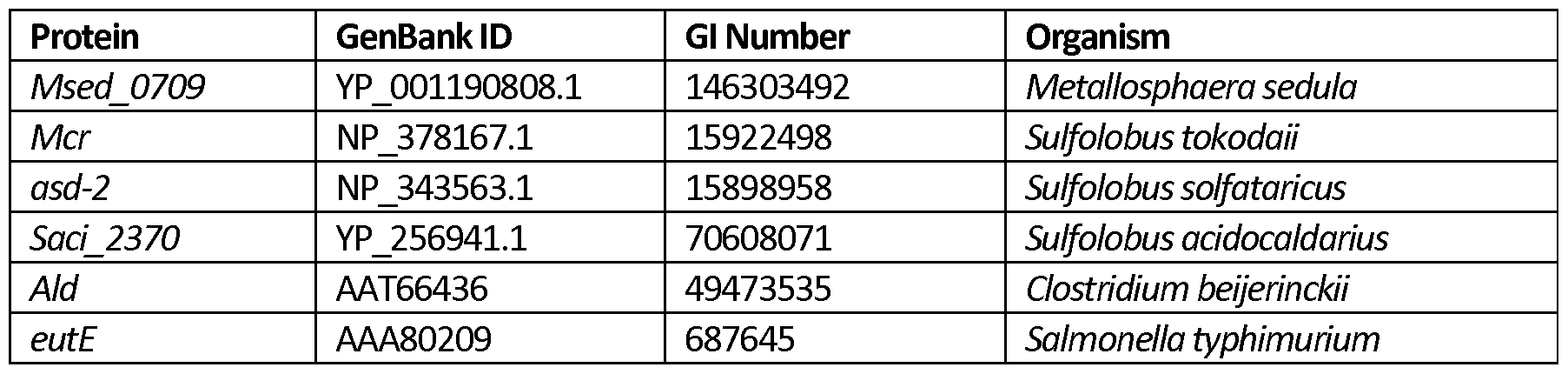 An additional enzyme type that converts an acyl-CoA to its corresponding aldehyde is malonyl-CoA reductase which transforms malonyl-CoA to malonic semialdehyde. Malonyl-CoA reductase is a key enzyme in autotrophic carbon fixation via the 3-hydroxypropionate cycle in thermoacidophilic archaeal bacteria (Berg, Science 318:1782-1786 (2007); and Thauer, Sde«ce 318:1732-1733 (2007)). The enzyme utilizes NADPH as a cofactor and has been characterized in Metallosphaera and Sulfolobus sp. (Aha: et al., J. Bacteriol. 188:8551-8559 (2006); and Hugler, J. Bacteriol. 184:2404-2410 (2002)). Exemplary enzymes include those in the followng table.
