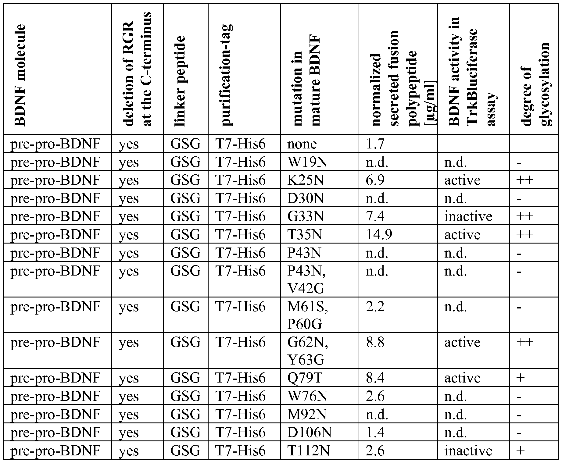 Determination of the biological activity of BDNF containing fusion polypeptides via a TrkB reporter gene assay The biological activity of BDNF variants and BDNF-containing fusion polypeptides was determined with a TrkB-receptor-transfected CHO cell line containing a stably transfected luciferase reporter gene under the control of a SRE (serum-response element)-containing -promoter (CHO-Cl-fiTrkB/pSRE-Luc). The day before the experiments cell medium was changed from growth medium (Ham's F12 containing 10 % FCS, 2 mM L-glutamine, 300 μg/mL G418 and 3 μg/mL puromycin) to the same medium without FCS for starvation. The next day, 105 cells were seeded per well of a 96-well plate in 50 μί medium. Then BDNF fusion proteins were added at concentrations between 0.02 nM and 115 nM, in 50 μΐ, medium. After incubation for 4 h at 37 °C, 7.5 % C02, cells were equilibrated for 30 min at RT and 100 μΐ^ of BrightGlo Luciferase Assay reagent