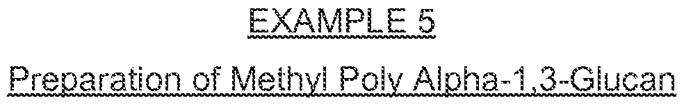 A 3-neck 250-mL round bottom flask with magnetic stir bar was charged with 200 g of 30% sodium hydroxide and 10 g (0.0617 moles) of poly alpha-1 ,3- glucan (Mw = -180000). This preparation was stirred at room temperature for 80 minutes. The solid was then filtered and air swept-dried in the filter for 5 minutes to yield 35.547 g of off-white solids. The solids were then charged into a pressure vessel along with 100 g of methyl chloride and the contents were stirred at 50 °C for 10 hours. The solids were collected and placed into 150 mL of 95 °C water, stirred for 30 seconds, and filtered (filtrate was yellow). The solids were again stirred in water at 80-90 °C for 3 minutes; the pH of the solids was determined to be neutral. The final solid material was filtered and dried in an 85 °C vacuum oven to afford 7.3 g of an off-white solid. This material was analyzed by N R, which determined that methyl poly a!pha-1 ,3-g!ucan was produced having a DoS of about 1.41.