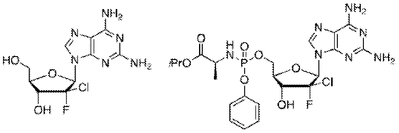 i) Purification of Human Polymerase y: The recombinant large and small subunits of polymerase γ were purified as described previously (see Graves SW, Johnson AA, Johnson KA. Expression, purification, and initial kinetic characterization of the large subunit of the human mitochondrial DNA polymerase. Biochemistry. 1998, 37, 6050-8; Johnson AA, Tsai Y, Graves SW, Johnson KA. Human mitochondrial DNA polymerase holoenzyme: reconstitution and characterization. Biochemistry 2000; 39: 1702-8). The protein concentration was determined spectrophotometrically at 280 nm, with extinction coefficients of 234,420, and 71,894 M-1 cm-1 for the large and the small subunits of polymerase γ, respectively. ii) Kinetic Analyses of Nucleotide Incorporation: Pre-steady-state kinetic analyses were carried out to determine the catalytic efficiency of incorporation (k/K) for DNA polymerase γ for nucleoside-TP and natural dNTP substrates. This allowed determination of the relative ability of this enzyme to incorporate modified analogs and predict toxicity. Pre- steady-state kinetic analyses of incorporation of nucleotide analogs by DNA polymerase γ would be carried out essentially as described previously (see Murakami E, Ray AS, Schinazi RF, Anderson KS. Investigating the effects of stereochemistry on incorporation and removal of 5-fluorocytidine analogs by mitochondrial DNA polymerase gamma: comparison of D- and L-D4FC-TP. Antiviral Res. 2004, 62, 57-64; Feng JY, Murakami E, Zorca SM, Johnson AA, Johnson KA, Schinazi RF, Furman PA, Anderson KS. Relationship between antiviral activity and host toxicity: comparison of the incorporation efficiencies of 2',3'- dideoxy-5-fluoro-3'-thiacytidine-triphosphate analogs by human immunodeficiency virus type 1 reverse transcriptase and human mitochondrial DNA polymerase. Antimicrob Agents Chemother. 2004, 48, 1300-6). Briefly, a pre- incubated mixture of large (250 nM) and small (1.25 mM) subunits of polymerase γ and 60nM DNA template/primer in 50mM Tris- HC1, 100 mM NaCl, pH 7.8, was added to a solution containing MgCl2 (2.5 mM) and various concentrations of nucleotide analogs. Reactions were quenched and analyzed as described previously. Data were fit to the same equations as described above, and the results in μΜ are shown below in Table 5.
