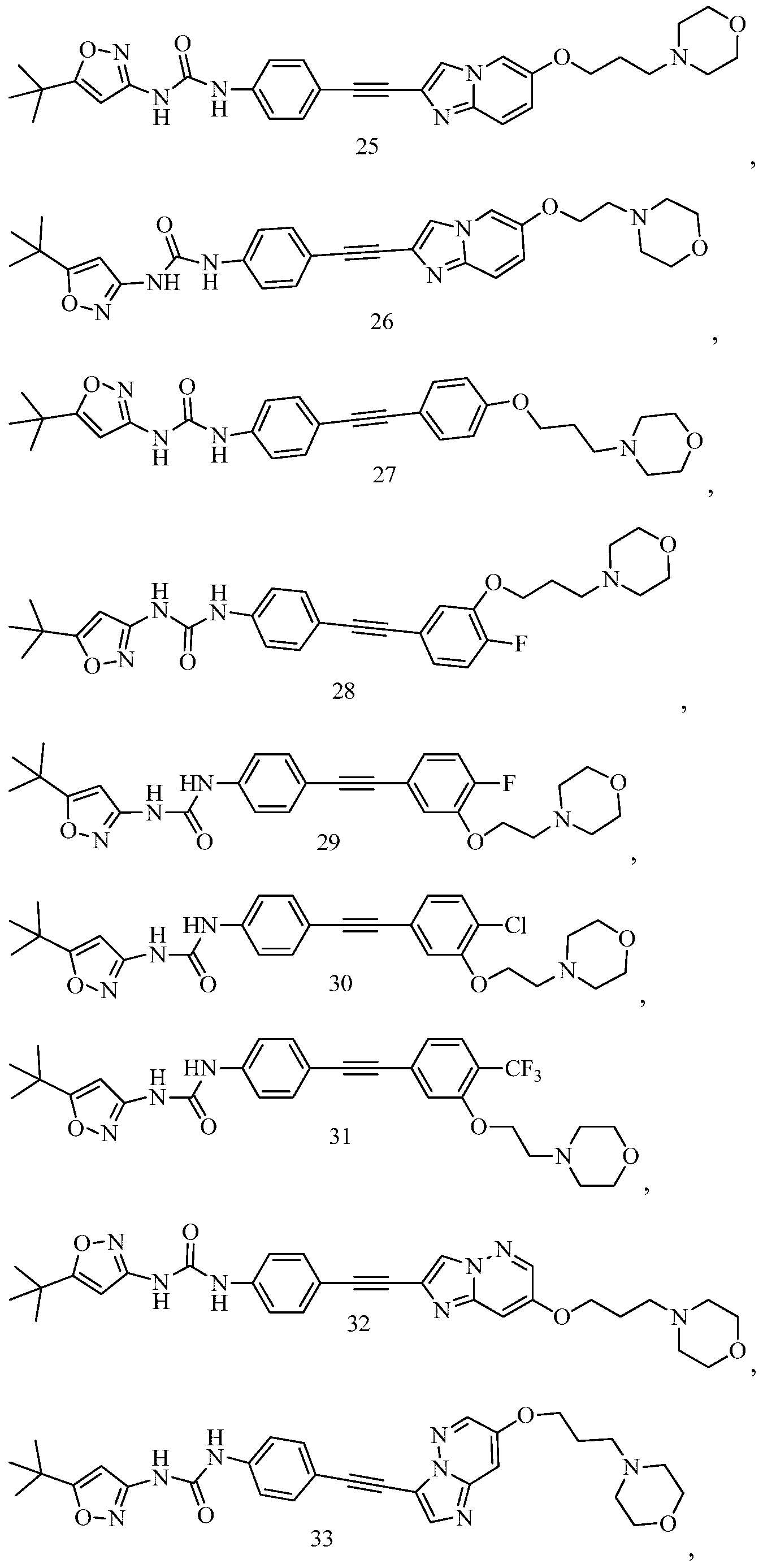 - ZAQKZHNRUSMXBK-UHFFFAOYSA-N CC(C)(C)c1cc(NC(Nc(c(OC)c2)ccc2C#Cc(cc2)ccc2OCCCN2CCOCC2)=O)n[o]1 Chemical compound CC(C)(C)c1cc(NC(Nc(c(OC)c2)ccc2C#Cc(cc2)ccc2OCCCN2CCOCC2)=O)n[o]1 ZAQKZHNRUSMXBK-UHFFFAOYSA-N 0.000 description 1