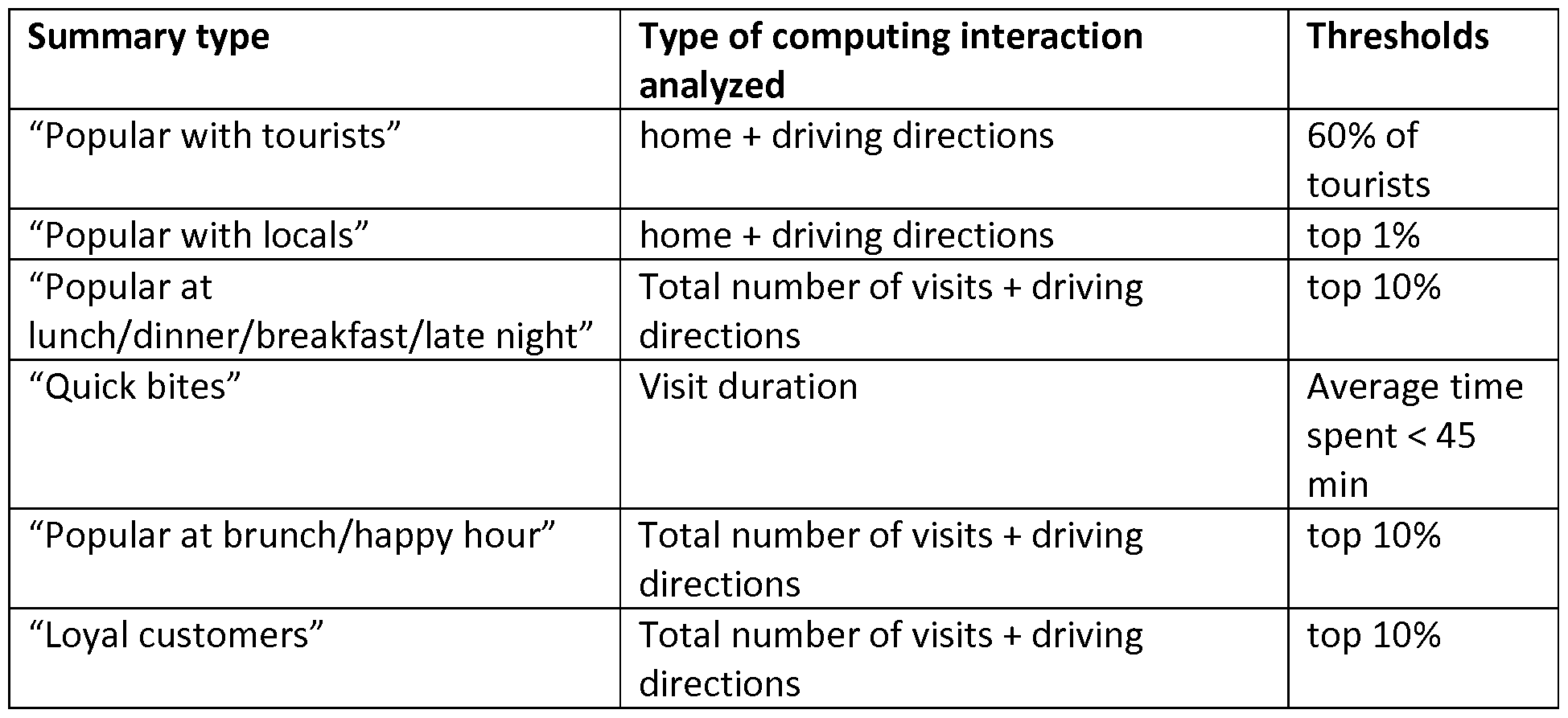 - the first computing interaction measure may be indicative of duration of interactions with the location and the second measure may be a static threshold duration. If the first computing interaction measure fails to satisfy the threshold duration, the aspect may be indicative of a "quick-stop" business (e.g., a quick- bites restaurant) and if it satisfies the threshold duration, the aspect may be indicative of a "long-stop" business (e.g., a long sit-down restaurant).
