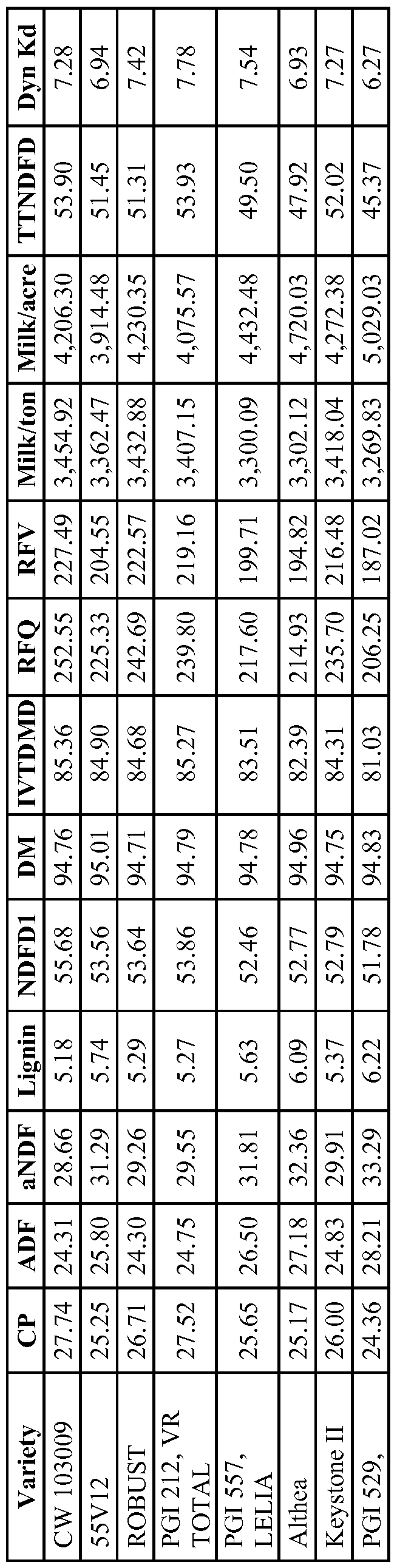- the alfalfa variety may have at least about 5.0% to about 25.0% more total digestible nutrient, 5.0% to about 25.0% more relative forage quality, 5.0% to about 25.0% more relative forage value, or 5.0% to about 25.0% more milk per ton of dry mass compared to the commercial alfalfa variety grown under the same field growing conditions.