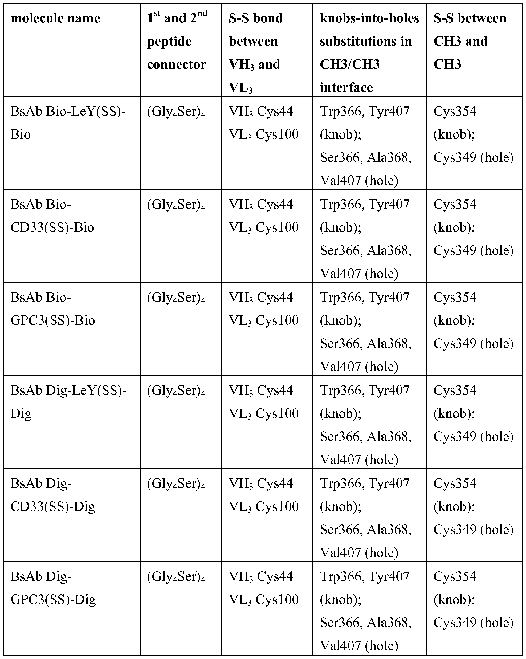 The bispecific antibodies included the characteristics indicated in Tables 5 and 6. All constructs comprised constant light chain domains of kappa isotype. In addition, in all constructs, the "knobs" substitutions were introduced in the CH3 domain fused to VH3 and the "hole" substitutions were introduced in the CH3 domain fused to VL3.