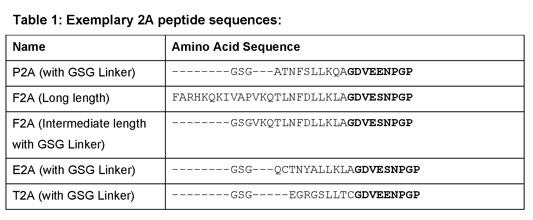 [044] In an eighth embodiment, the invention provides a nucleic acid according to any one of the preceding embodiments, wherein the separation sequences are viral 2A sequences. Exemplary 2A sequences are provided in Table 1, infra, and can also readily be identified by the skilled artisan.