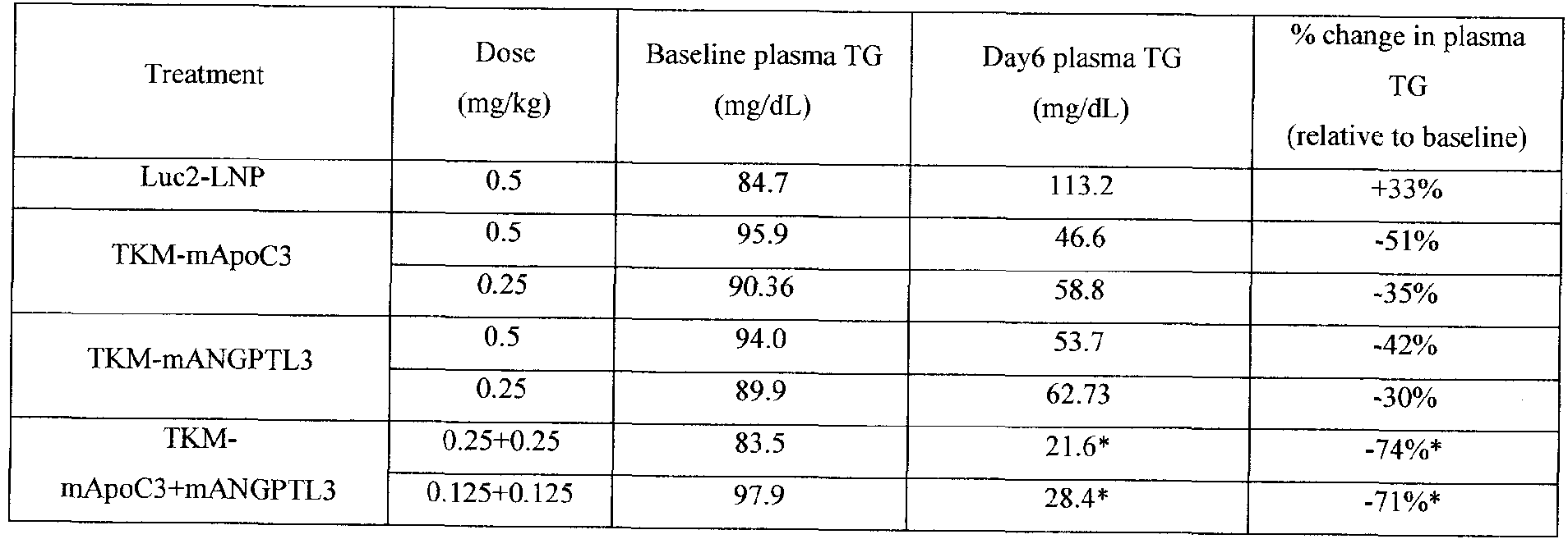 Table 11. Enhanced reduction in plasma TG with combo TKM-mApoC3+mANGPTL3 treatment 6 days following the first dose.